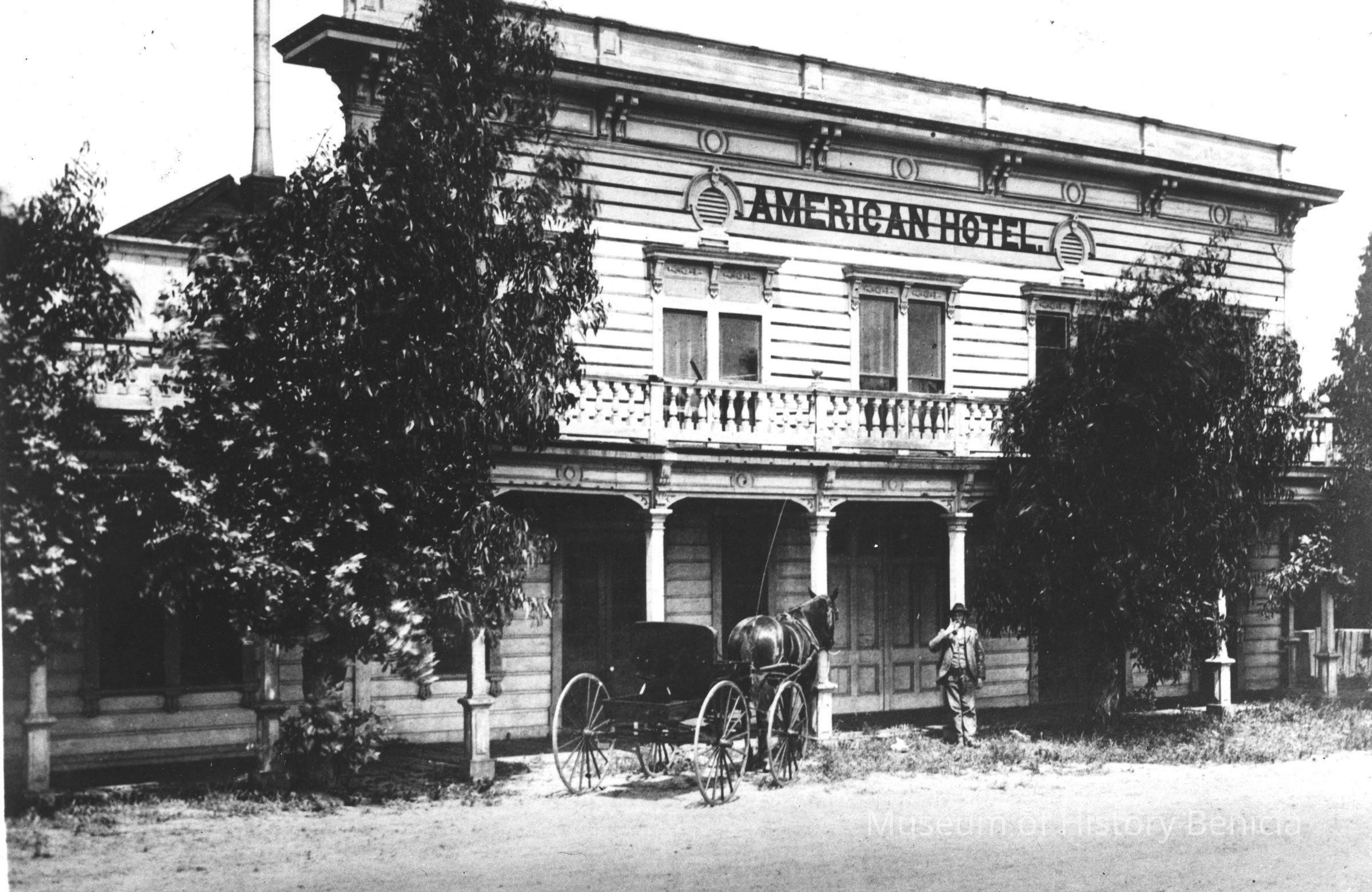 Copy of a photo of the "American Hotel" There is a horse and buggy out front with a man standing next to it.