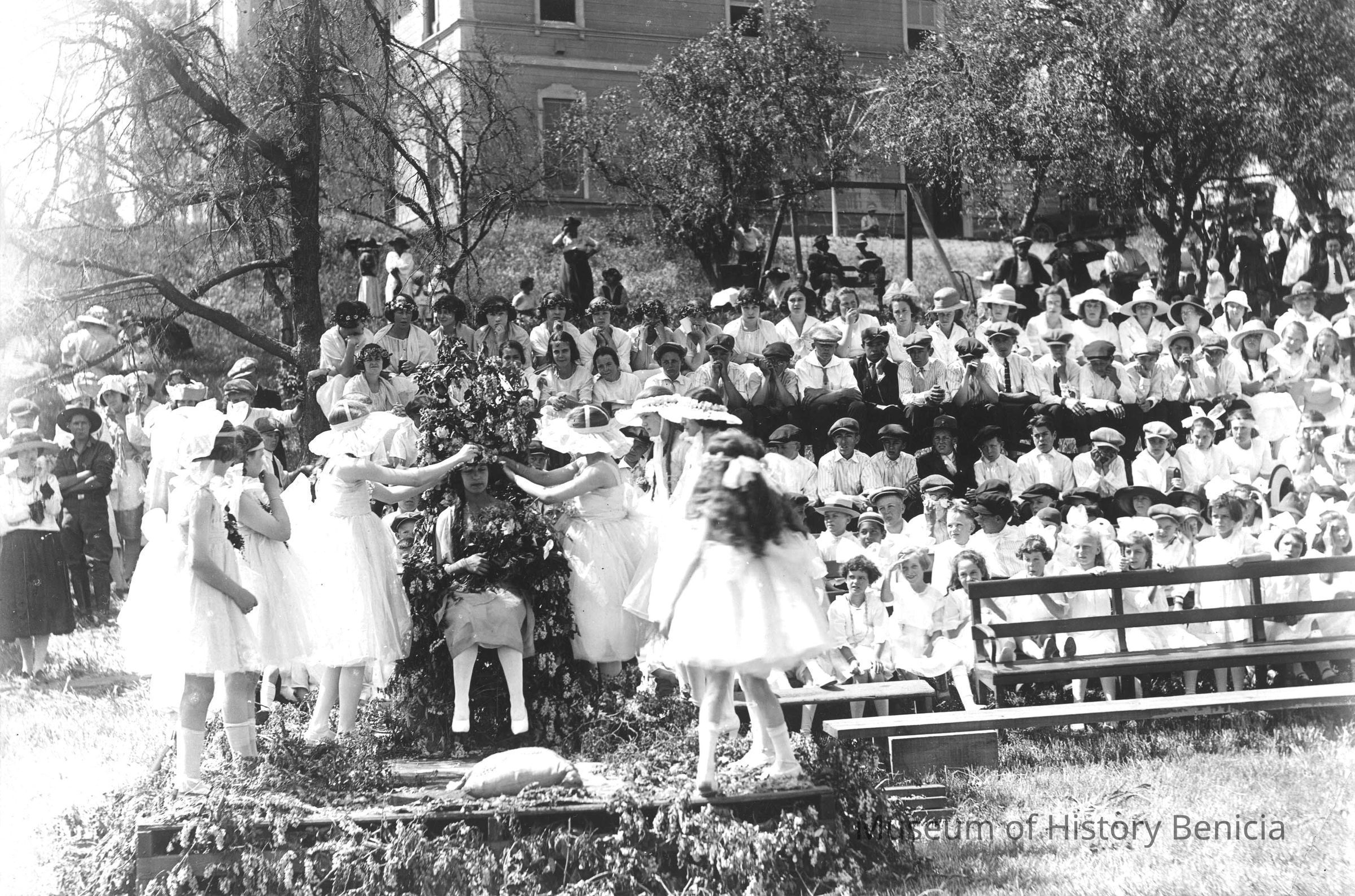 Photo of kids watching a girl receive her crown. The ceremony looks to be in front of a school.