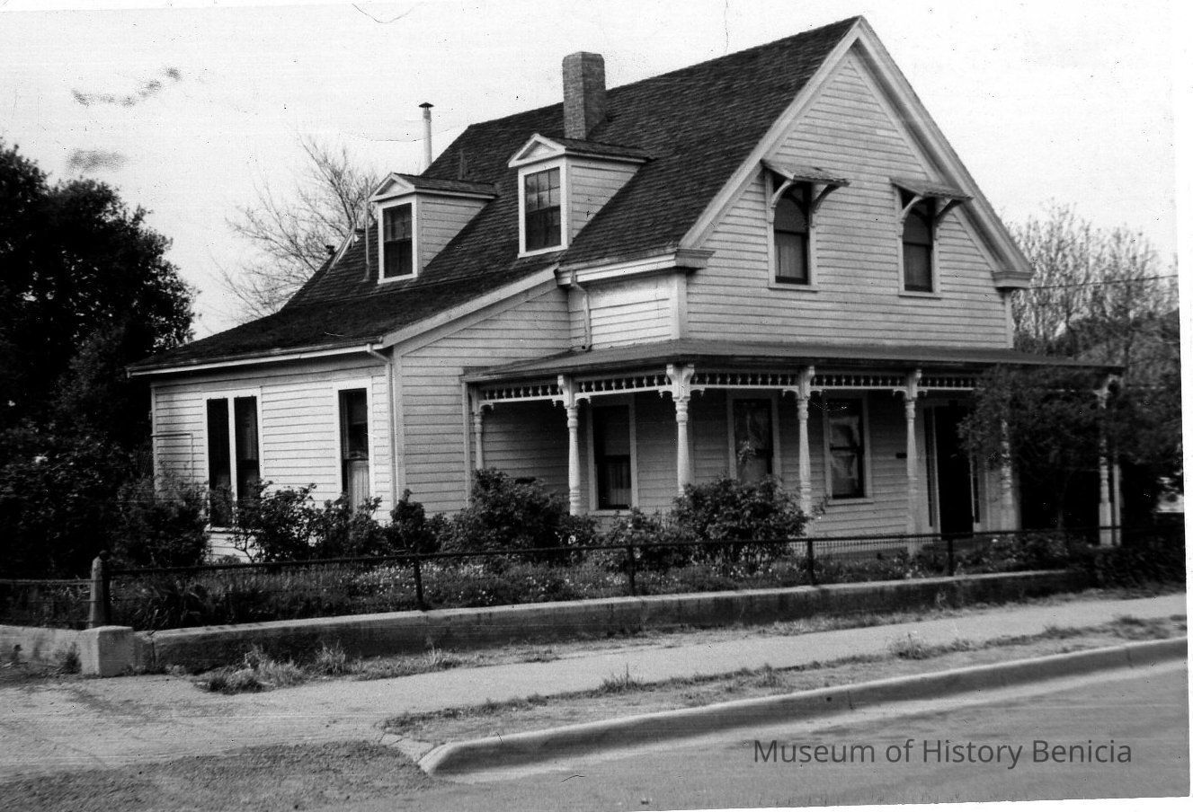 B/W photograph: shows a house at 150 West G Street west of the capitol building (in 2007 belongs to former Benicia Mayor Hayes) caption states the design for the interior stairs of the restored Benicia Capitol were taken from this house.