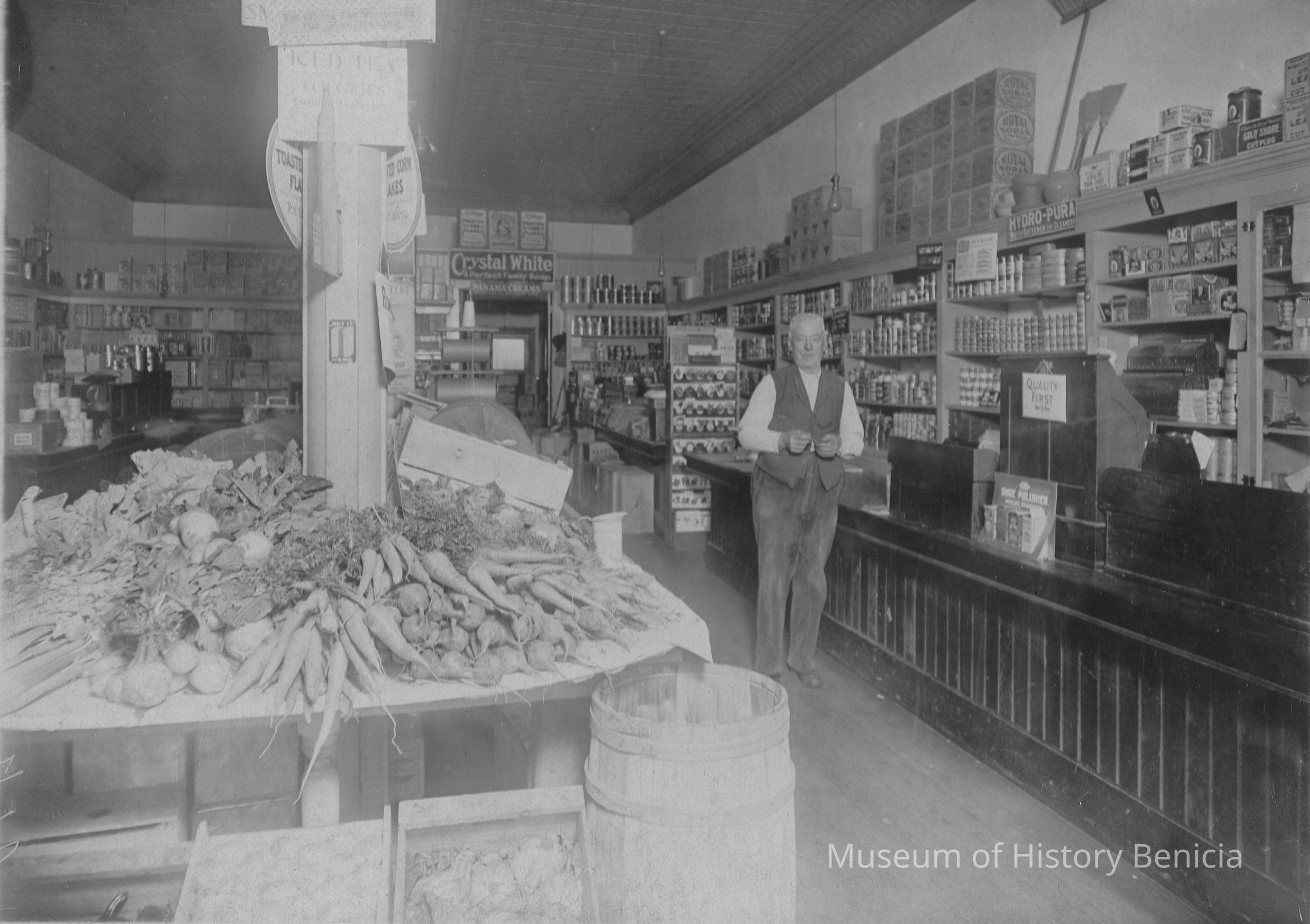 B/W interior photo of Pine Grocery Store. Store was located at UPEC Hall. Man in photo is A.J. Pine.
