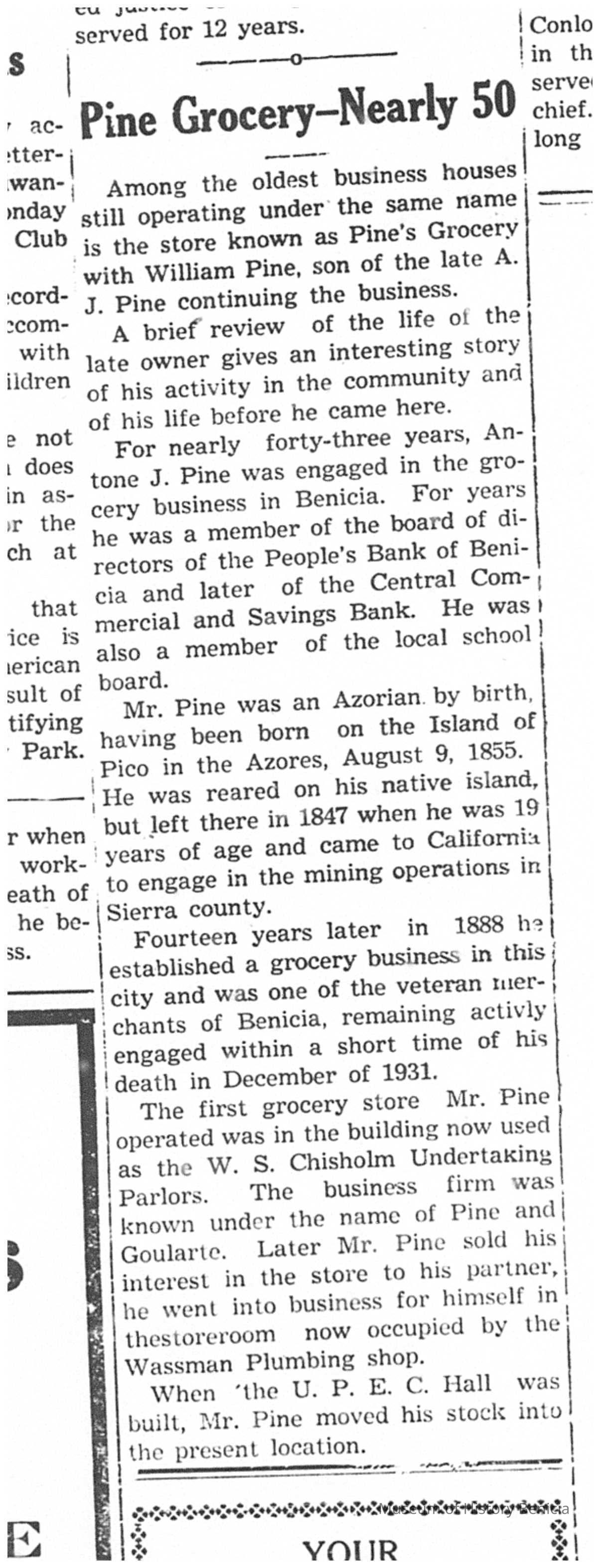Attached is an article from the 09/09/1937 Benicia Herald about the Pine Grocery history.Collection