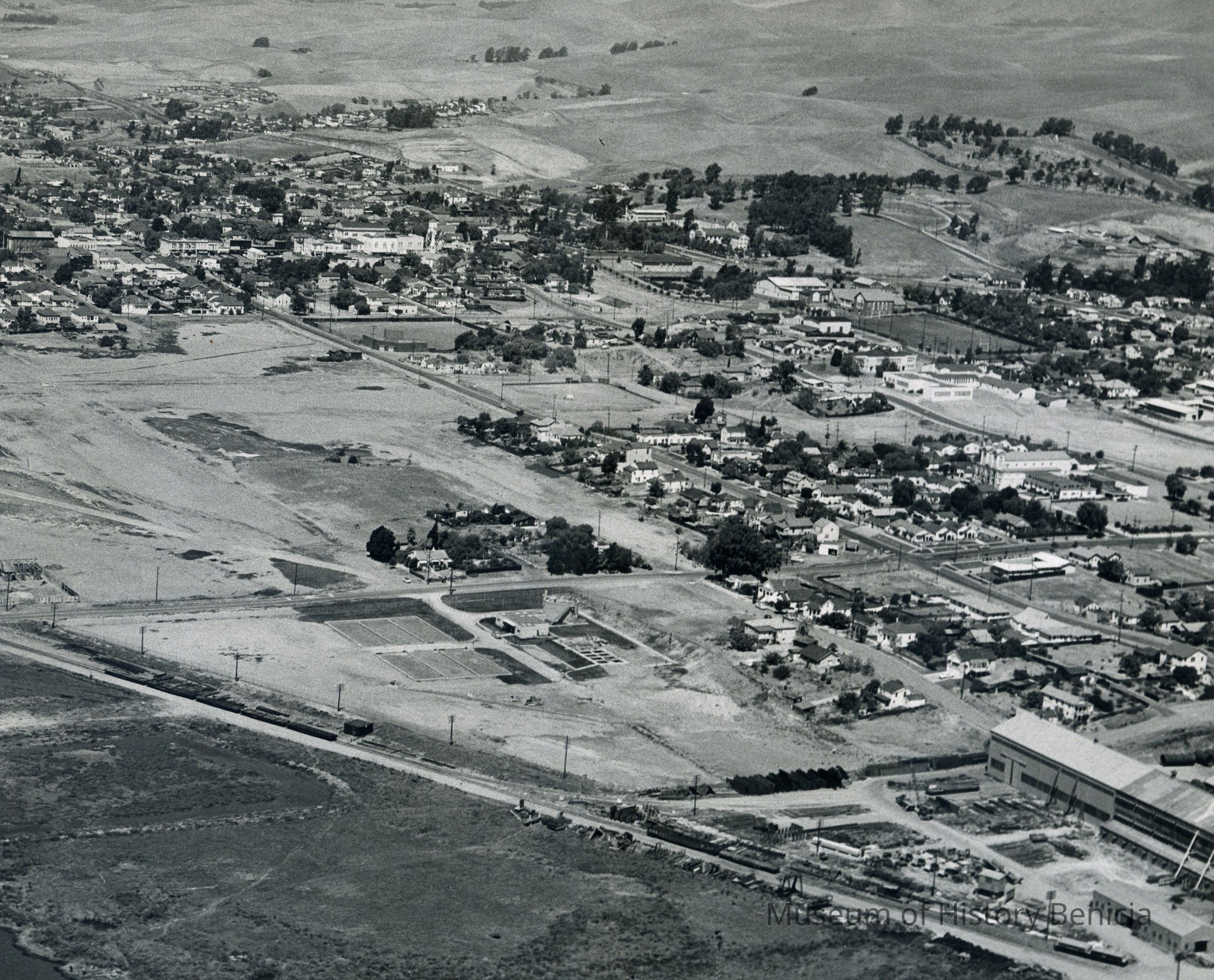 B/W Photograph - Aerial shot of the East side of Benicia in the foreground; Yuba is at the lower right; downtown Benicia is in the upper left; the mobile home park has not been put in and there are no Southampton homes on the hills; 08/27/1959