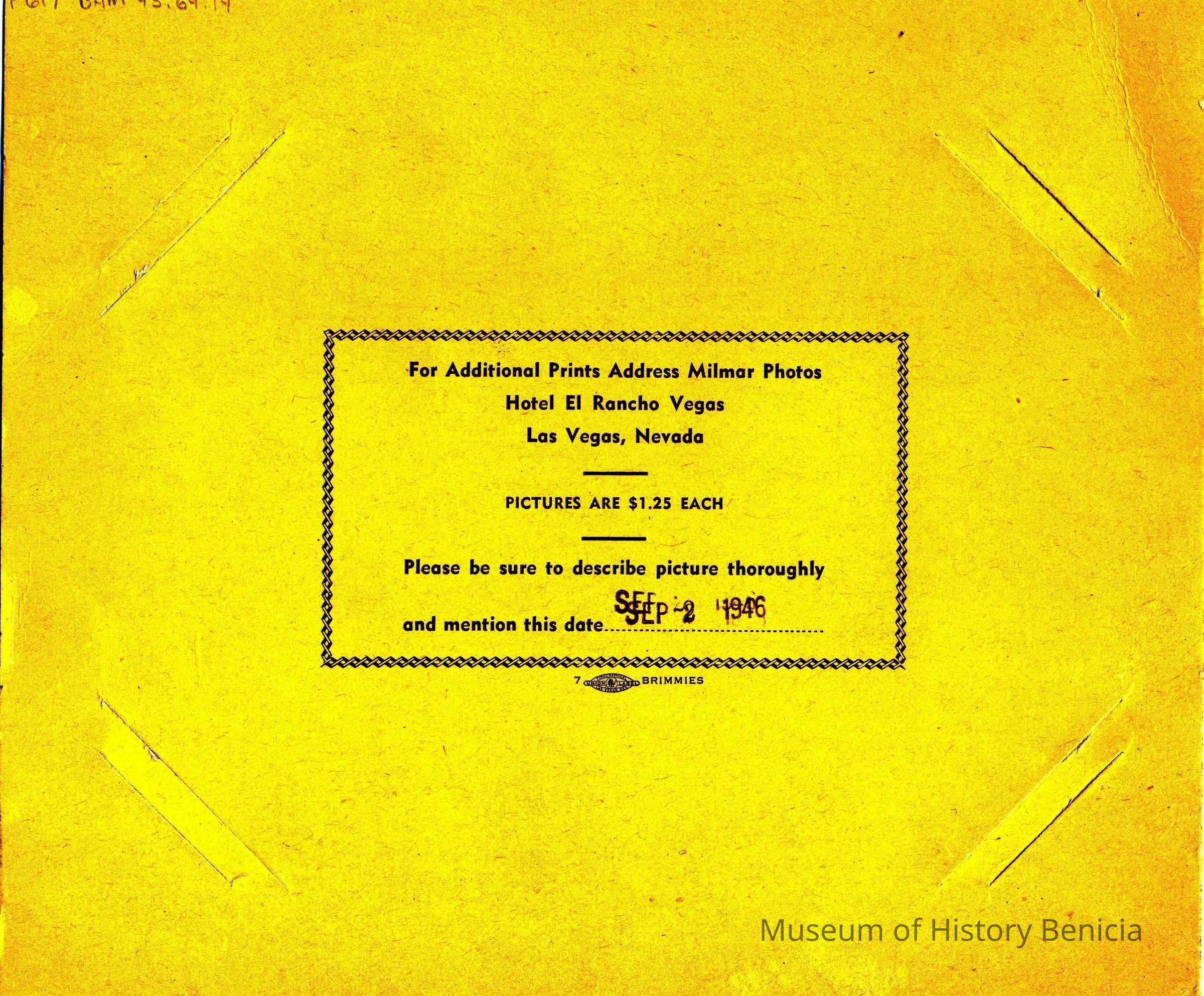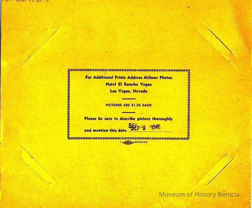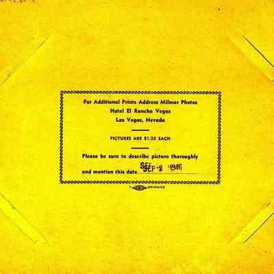 Hotel El Rancho Vegas, Las Vegas, NV yellow construction paper folio with paper inside; photo of two women and two men sitting around table in restaurant with two waiters in background. B/W photo.Collection