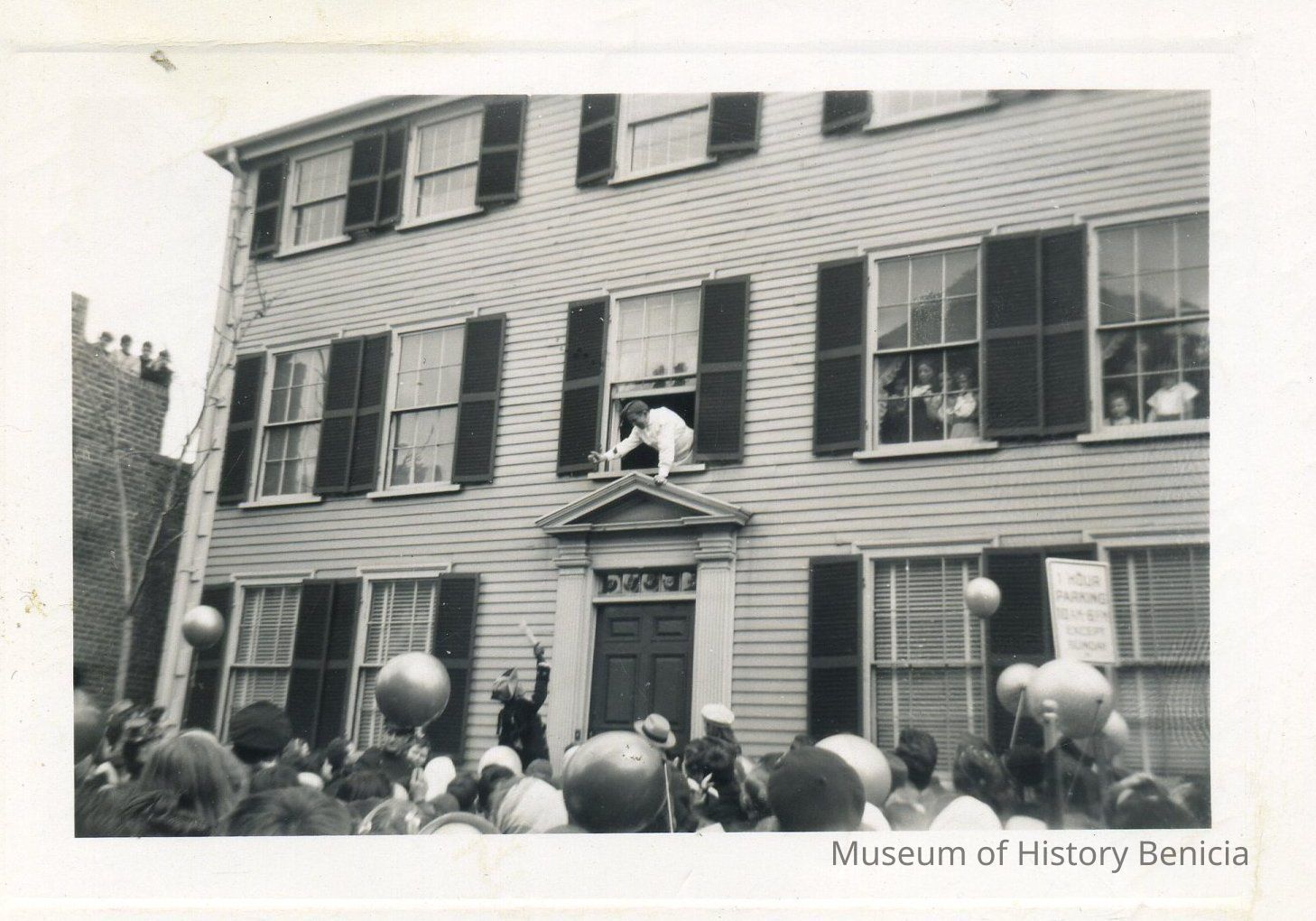 B/W photograph of a man leaning out of a second story window talking to a man on the ground; a group of people, some with balloons are looking on; has scalloped edge;