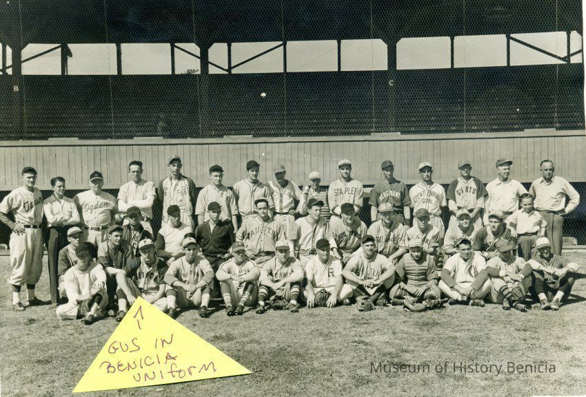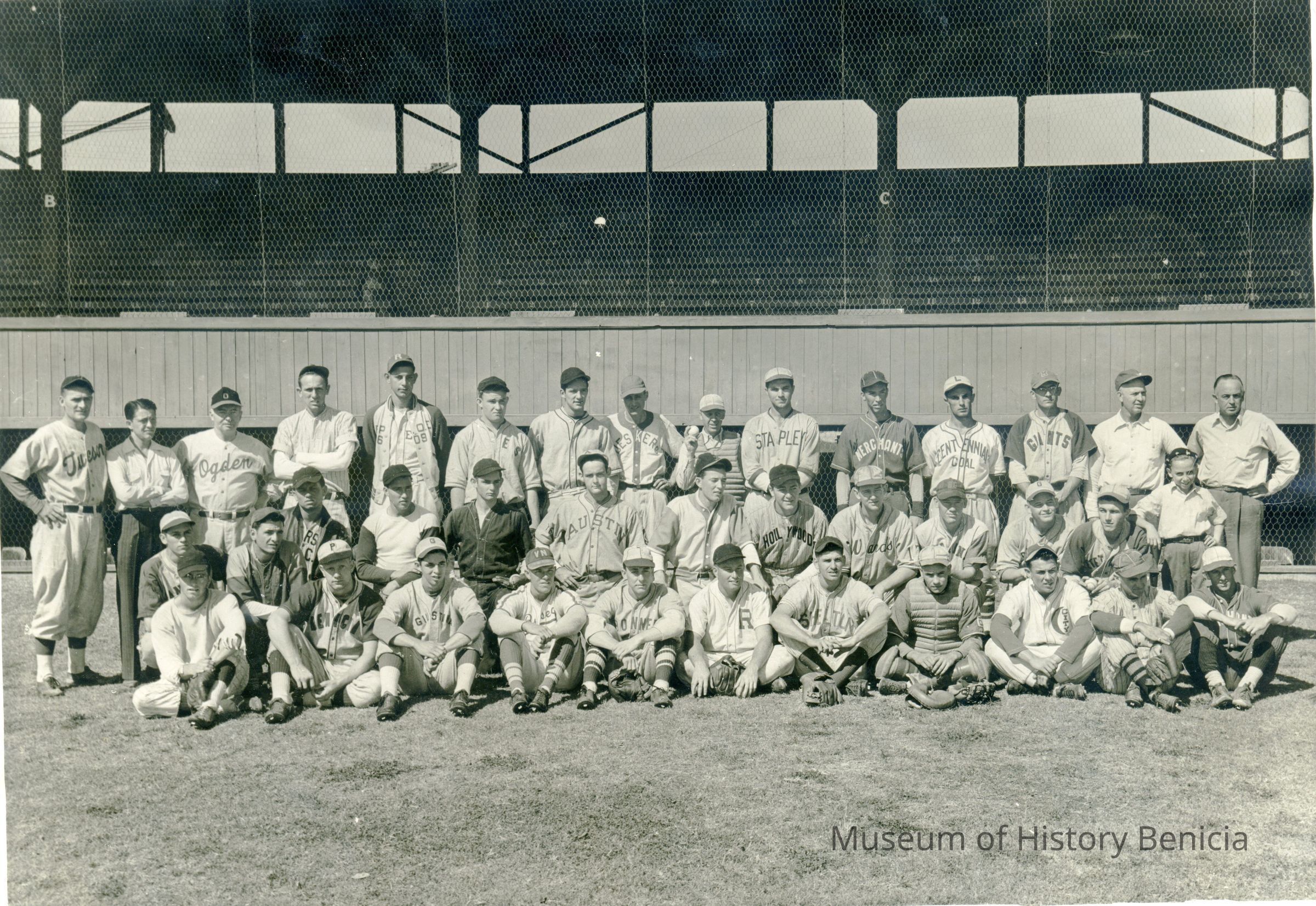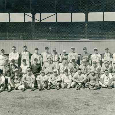 A photograph of Gus Kyriazi and other baseball team players. Since they all have different uniforms, this could be an all-star team that Gus played on.Collection