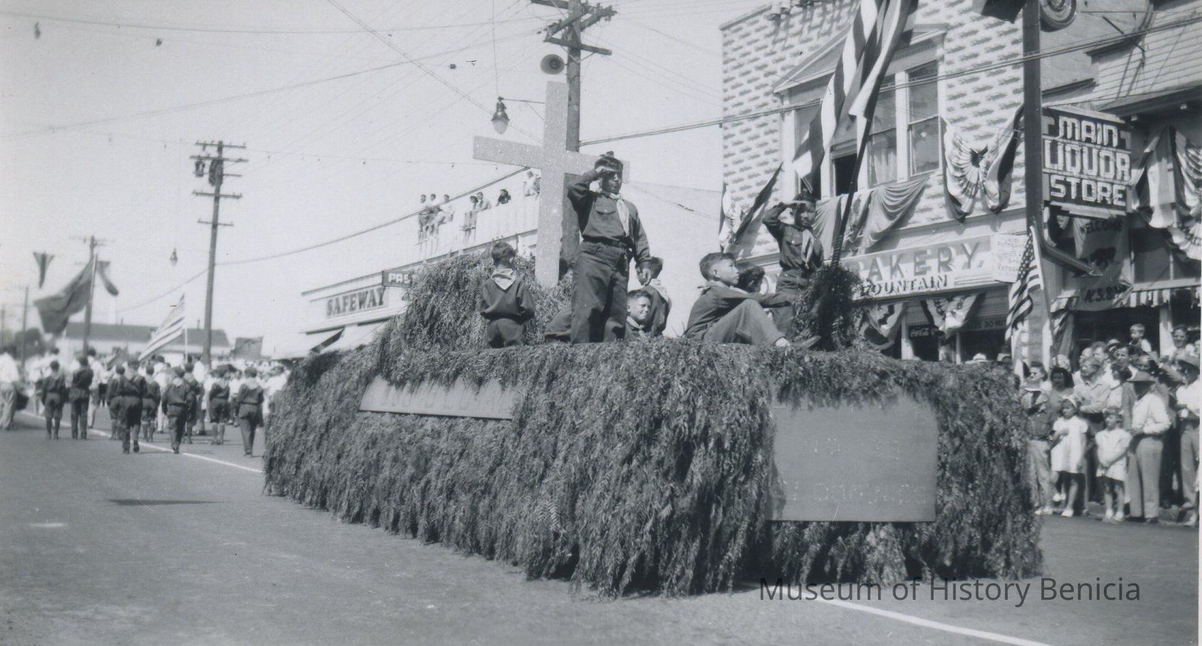 B/W Photograph - Parade on First Street; a "flost" carrying Boy Scouts and following a group of marching Scouts takes part in the parade. That day the State Theater was showing the movie, "The Dark Mirror", which was released in 1946. So, it is likely this parade took place in 1948 during the Old Timers' Celebration;