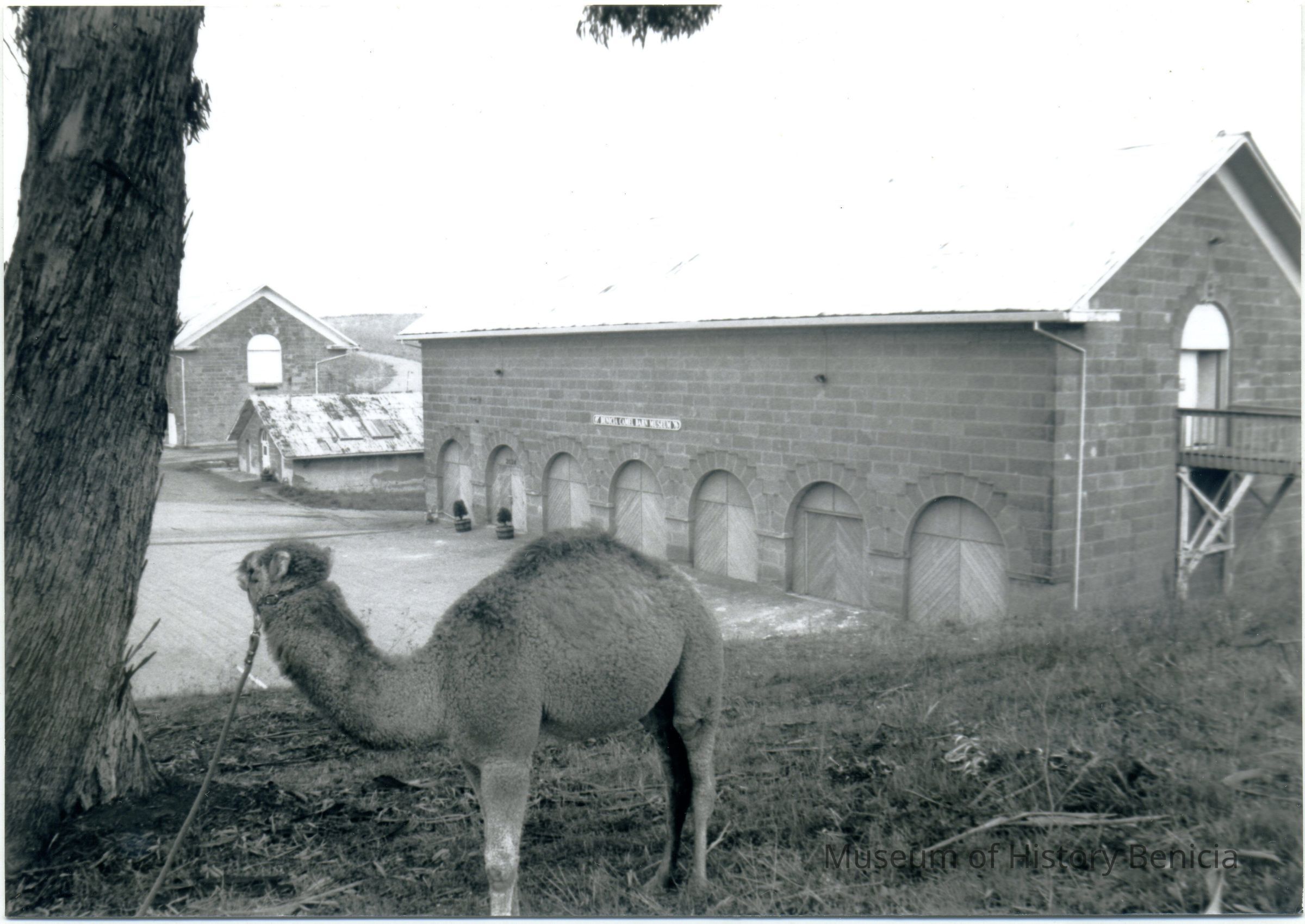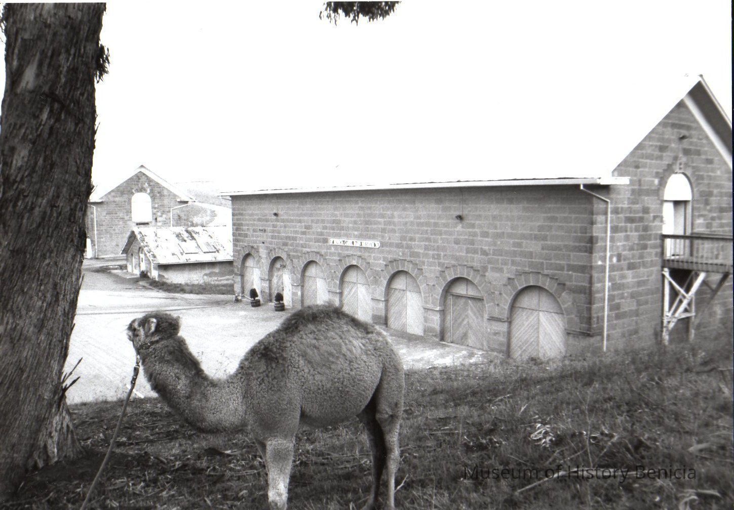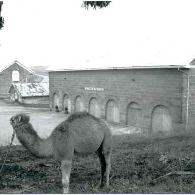 B/W photo Atar the camel with the museum buildings in the background appears to be a duplicate of BHM99.99.104