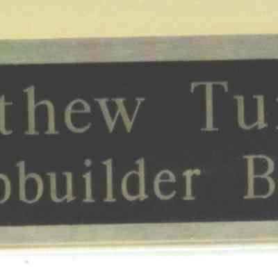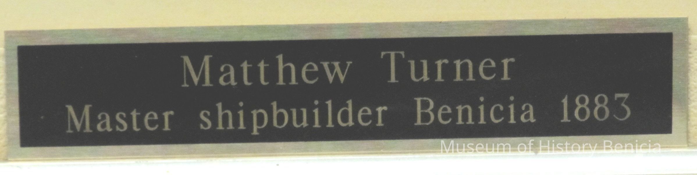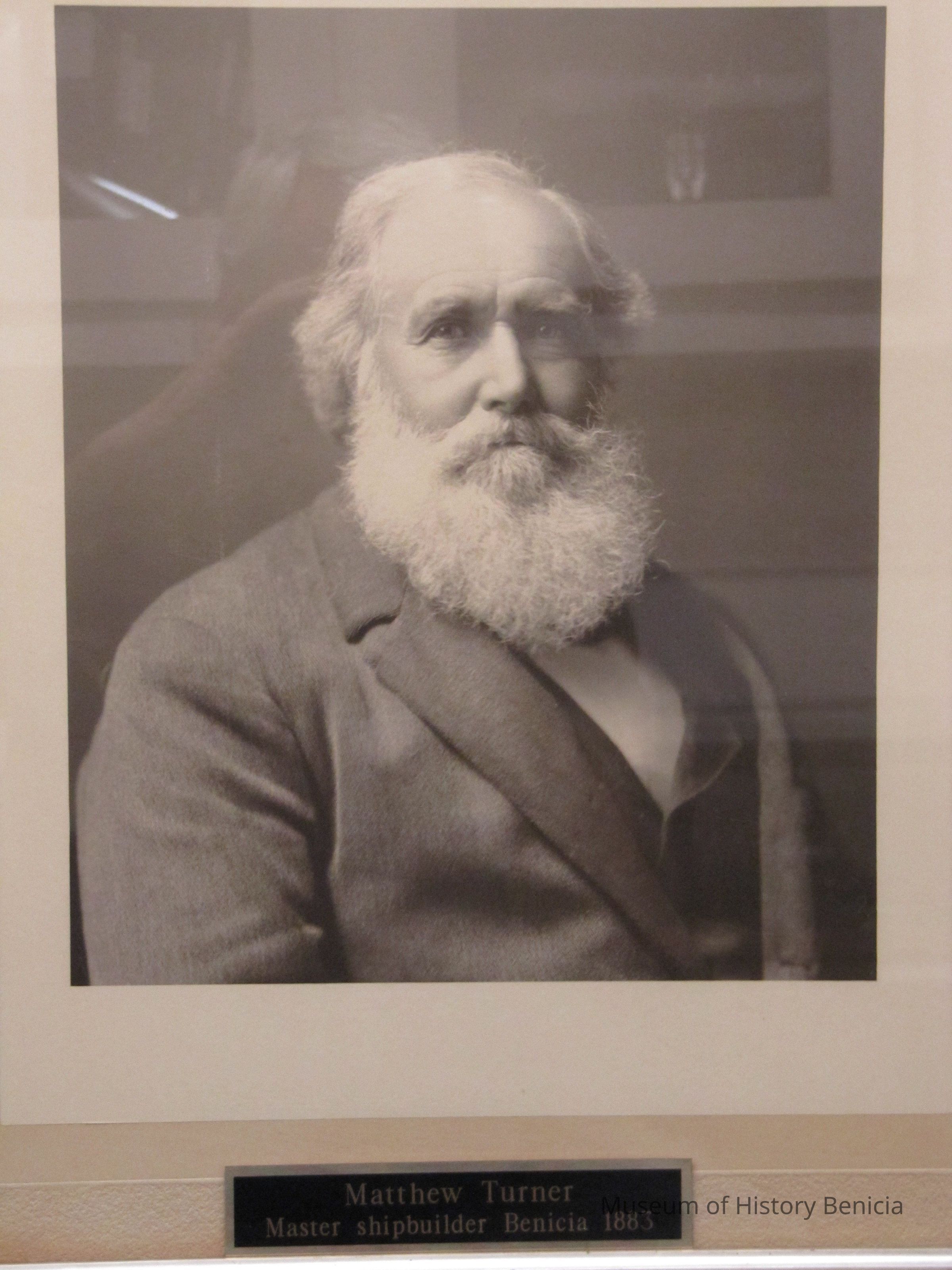 A framed photograph of Matthew Turner. The frame is 21" x 24.5" and the photo is 10" x 12". The frame is very ornate with metal scroll work in each corner and there is a name plate on the bottom showing Matthew Turner's name and "Master ship builder Benicia 1883".Collection