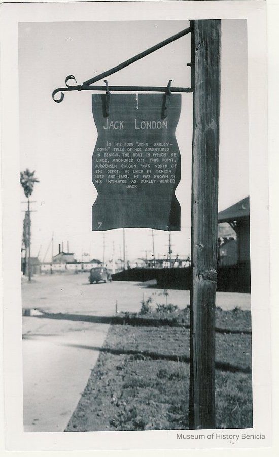 B/w photograph of a Jack London Historical Marker. Text Reads: In his book "John Barleycorn" tells of his adventures in Benicia, the boat in which he lived, anchored off this point. Jurgensen Saloon was north of the depot. He lived in Benicia 1892 and 1893. He was known to his intimates as curley headed Jack. The Lenoir Miller Collection.Collection