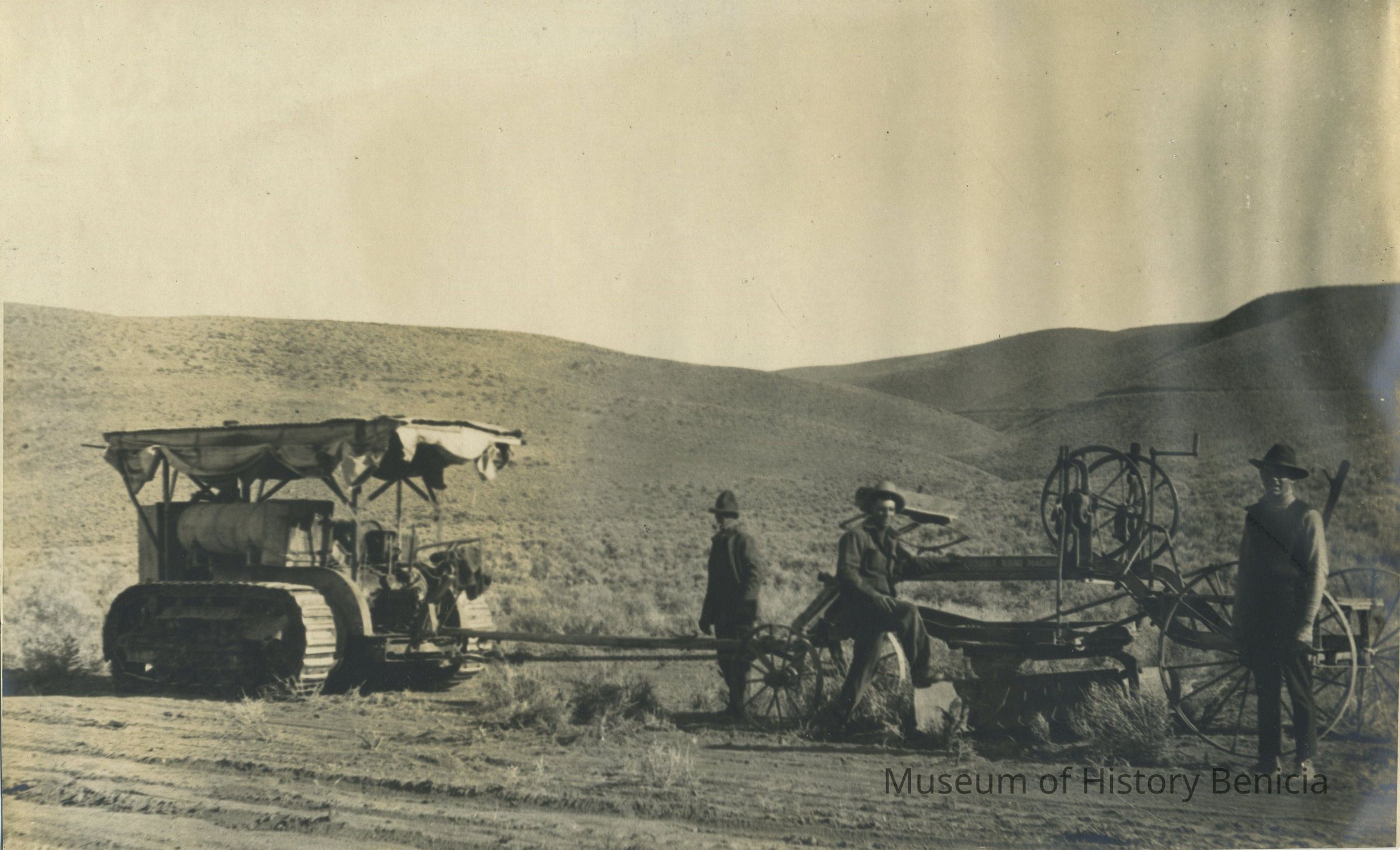 B/W photograh of three unidentified men standing by farming equipment in an open field with gently sloping hills in the background. The area is also unidentified.