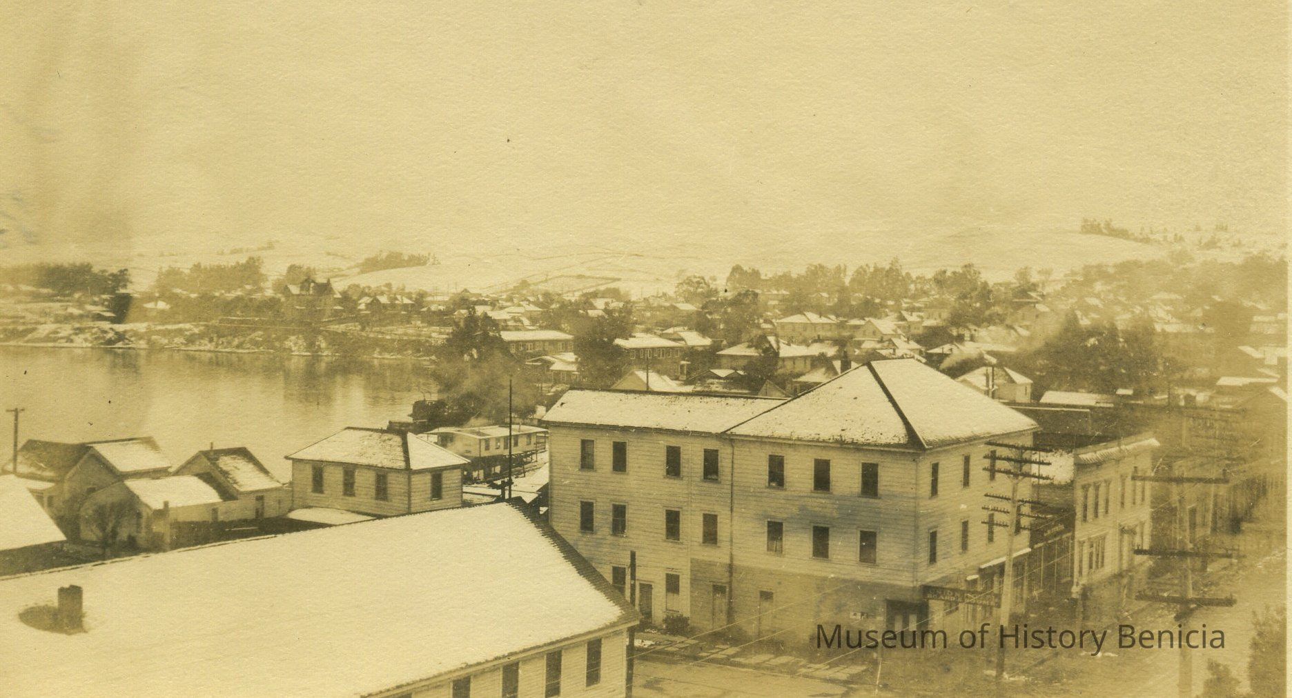 B/W Photograph - looking down on Benicia; the Union Hotel is prominent at lower right. Snow can be seen on the roofs. 3" x 5"