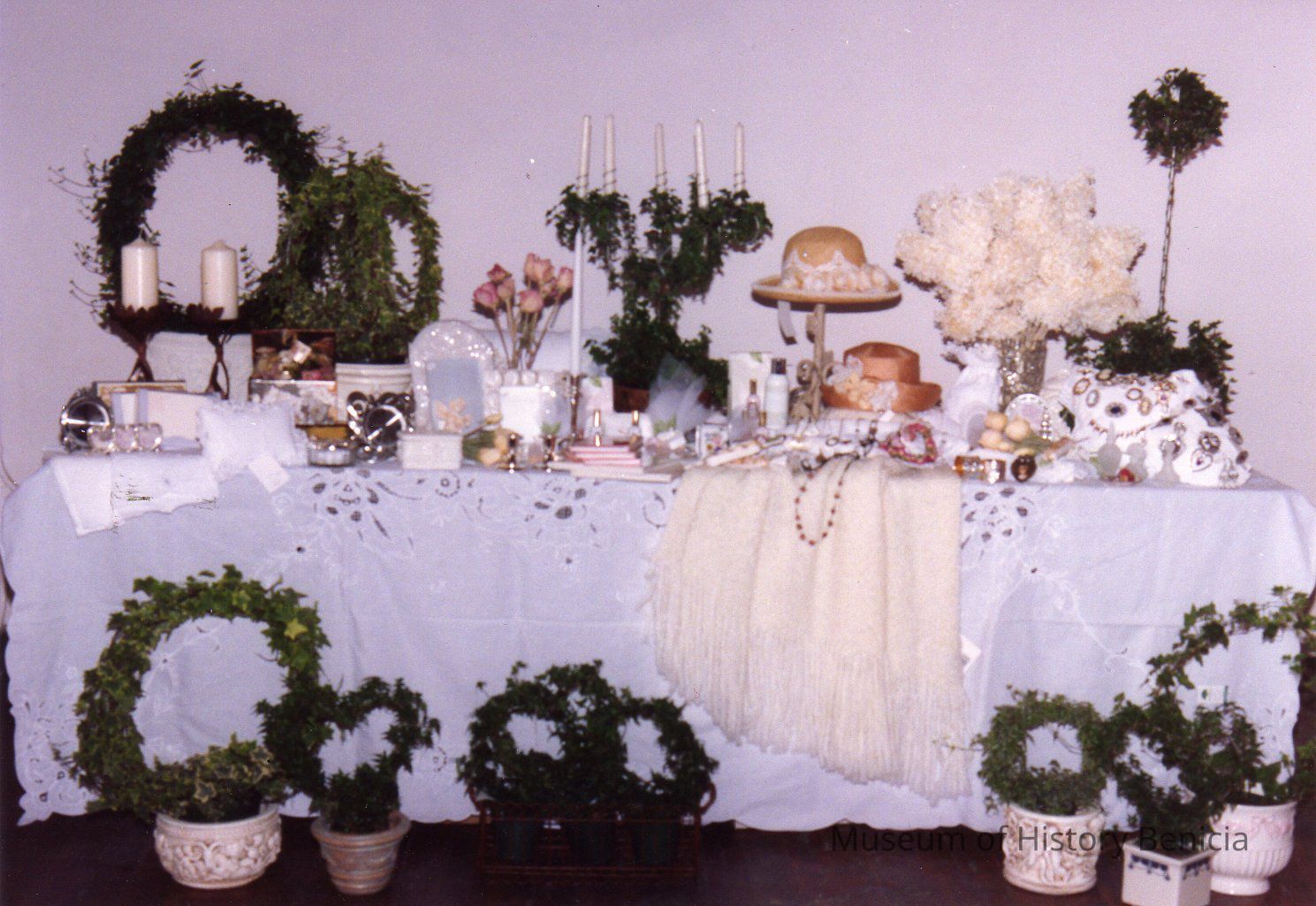 color photo of a table with a white table cloth covered with many objects: candles, wreathes, hats, jewelry, topiaries, picture frames, soaps (prizes?)Collection