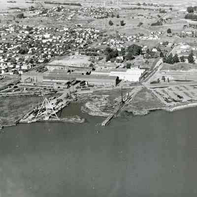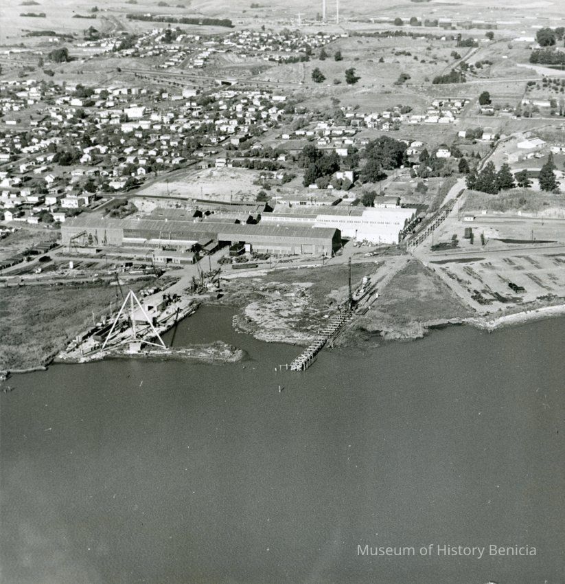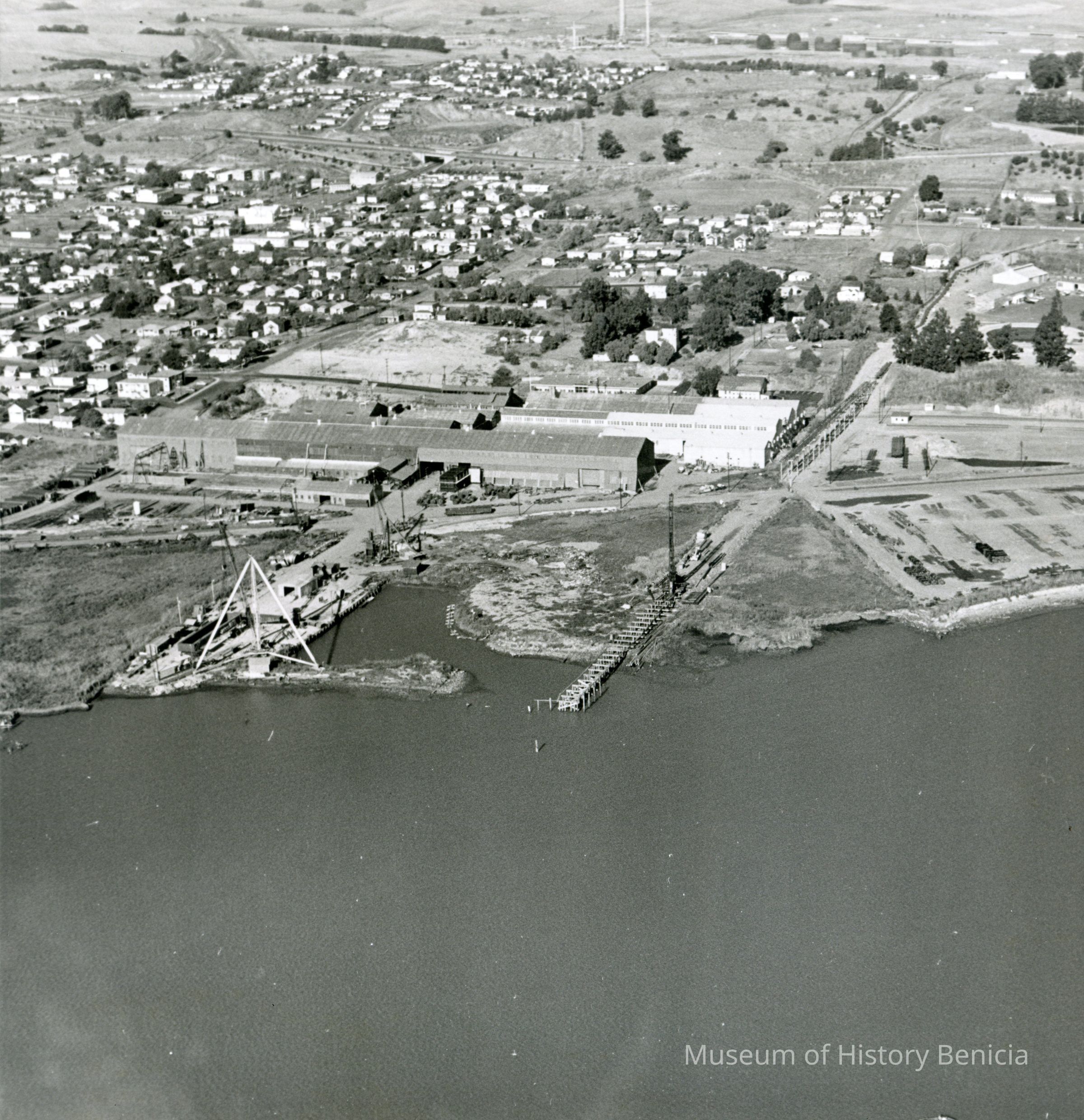 B/W aerial photo of the old Yuba complex from the direction of the Carquinez Straits (showing the shoreline). It is a possible pier site for the Healy Tibbitts Construction Company. The east side of Benicia (including the Viewmont and Highlands subdivisions) is visible in the upper left corner.Collection