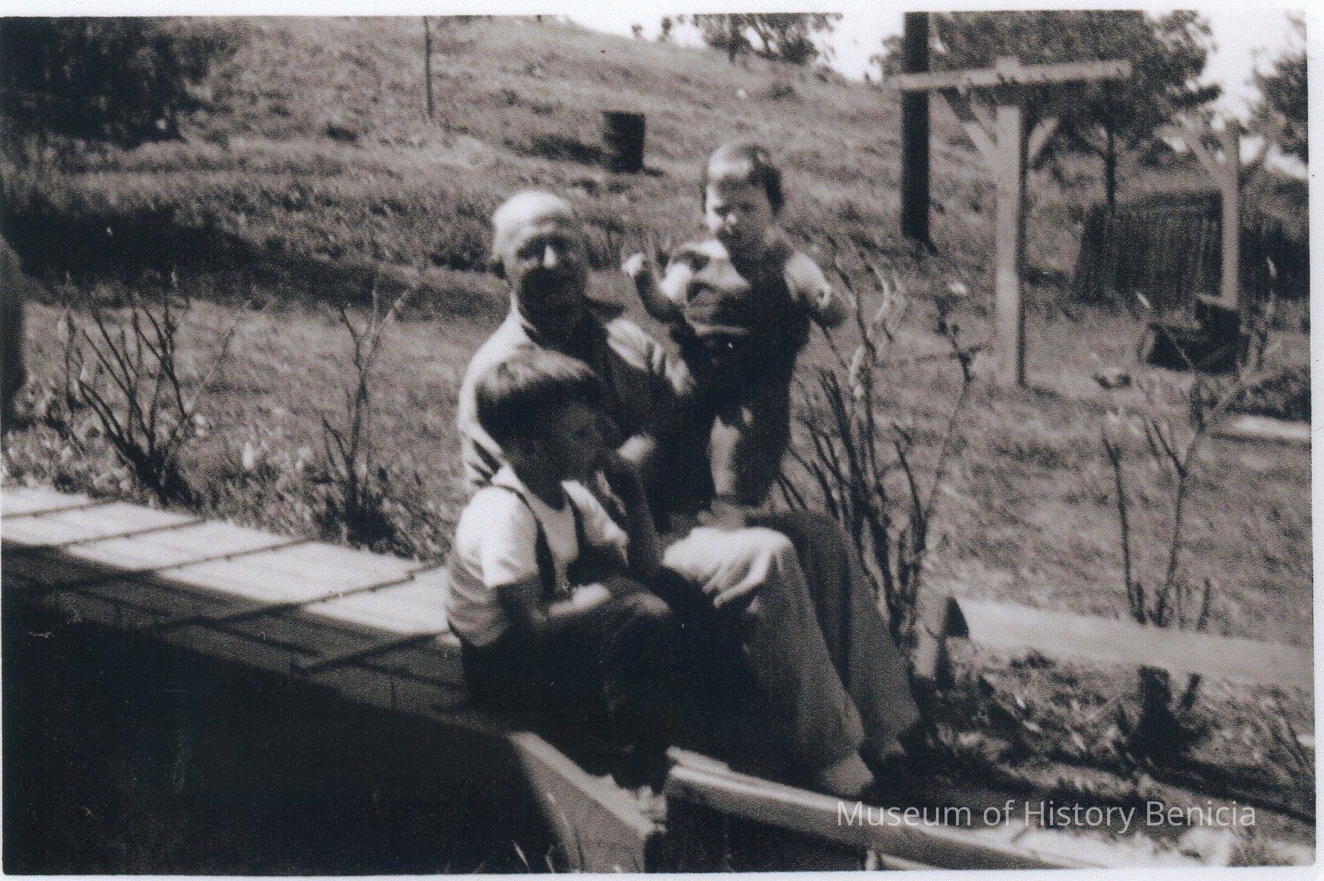James M. Garrett, Amos N. Garrett (father of Jim) and Elizabeth Garrett (granddaughter of Amos) sitting on a wooden sidewalk near their home in the temporary USA government housing on Larkin Drive in the Francesca Terrace Section to the east of East Fifth Street. In the background are the clothesline posts and burn can in the side yard. There were cement walks close to the houses but there were many wooden sidewalks leading up to the houses from the street.