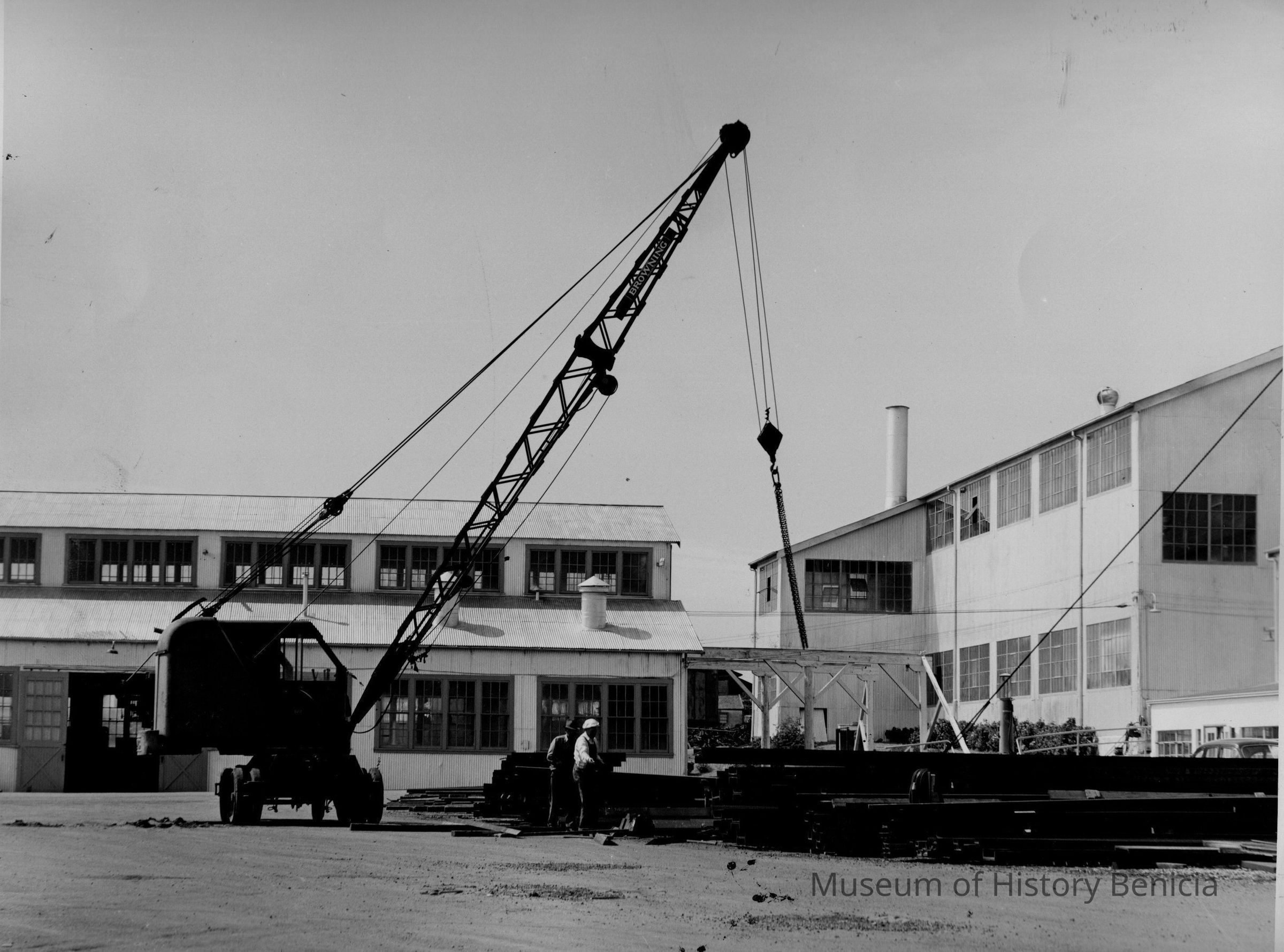 B/W photo of crane, two men, and stacks of metal beams, with industrial buildings in background. "Yuba Mfg Benicia" written on back.