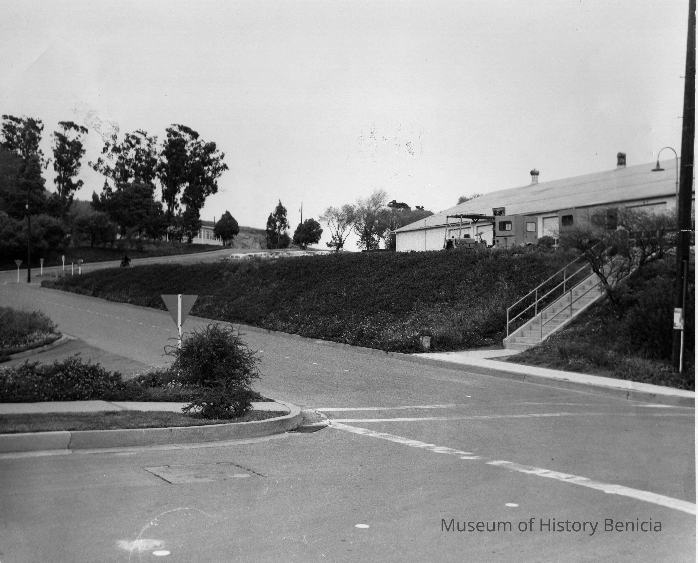 Intersection of streets. Bldg on hill at night (Bldg 93?) and another in background (106?). "Photo 2 of 9" in red ink at left "04071-797/AM-57...US Army Photograph" on back. B/W.Collection