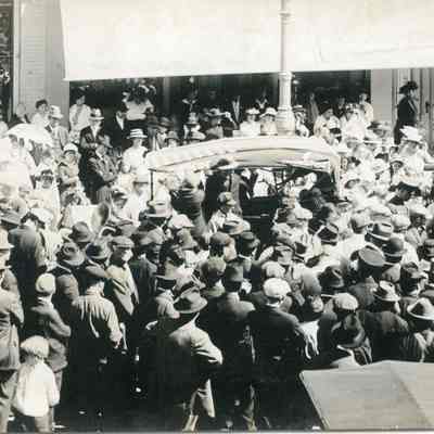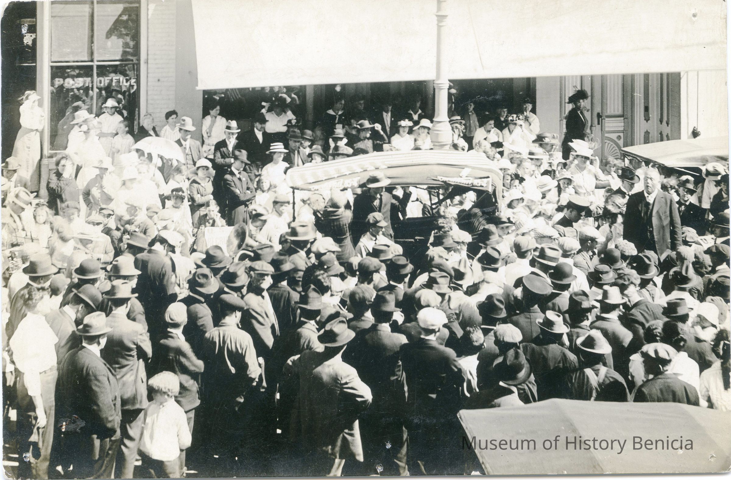 This is a photo of a crowd on First Street. It looks like a recruiting event for WWI.