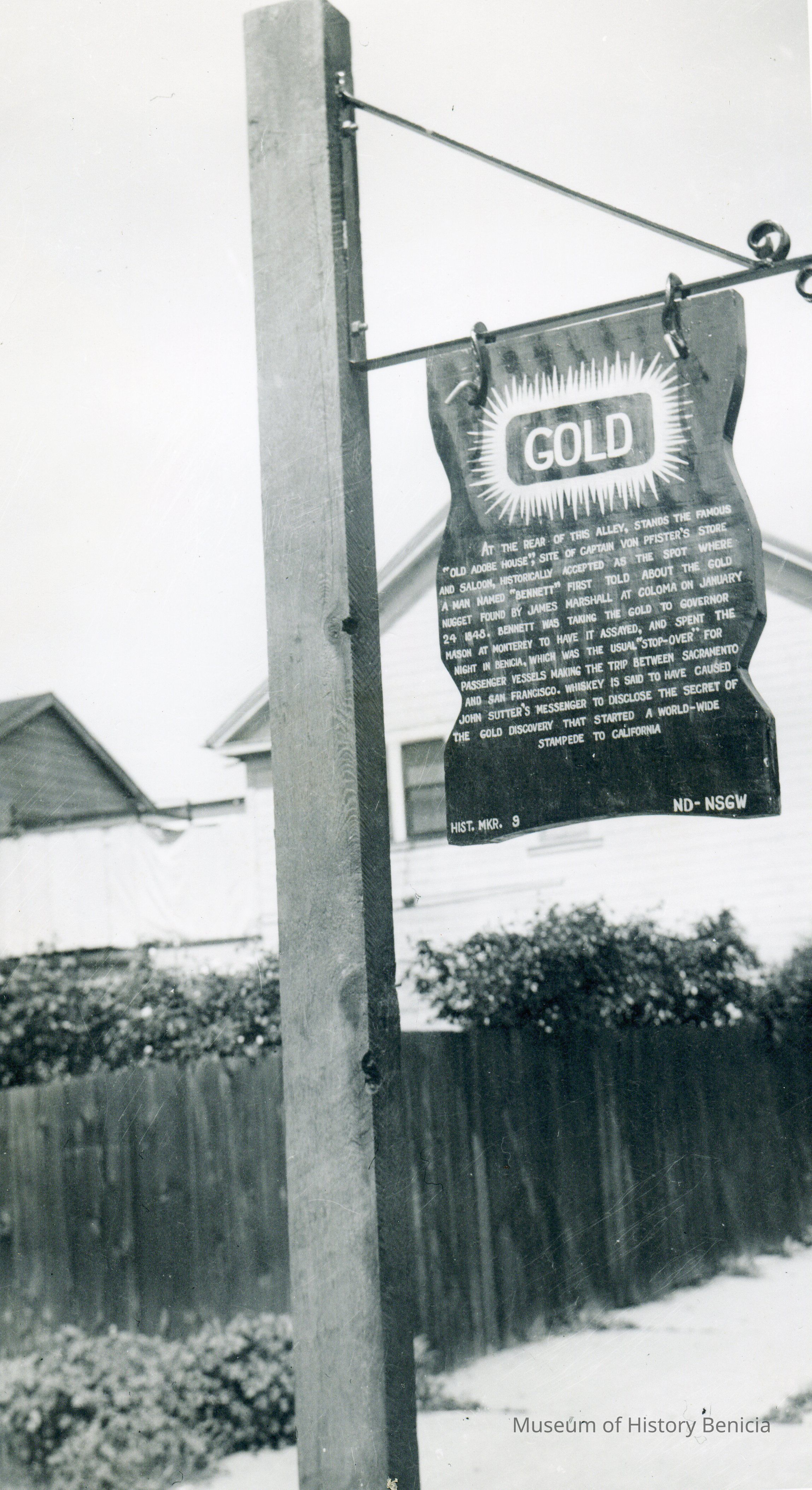 B/W photograph of a wooden historical marker number 9 "GOLD". It is located on west side of First Street between C and D Streets. The plaque describes how the secret of the gold discovery was leaked by a man named Bennett, who worked for John Marshall. It also marks the location of the von Pfister Adobe Store and Saloon where the event took place.Collection