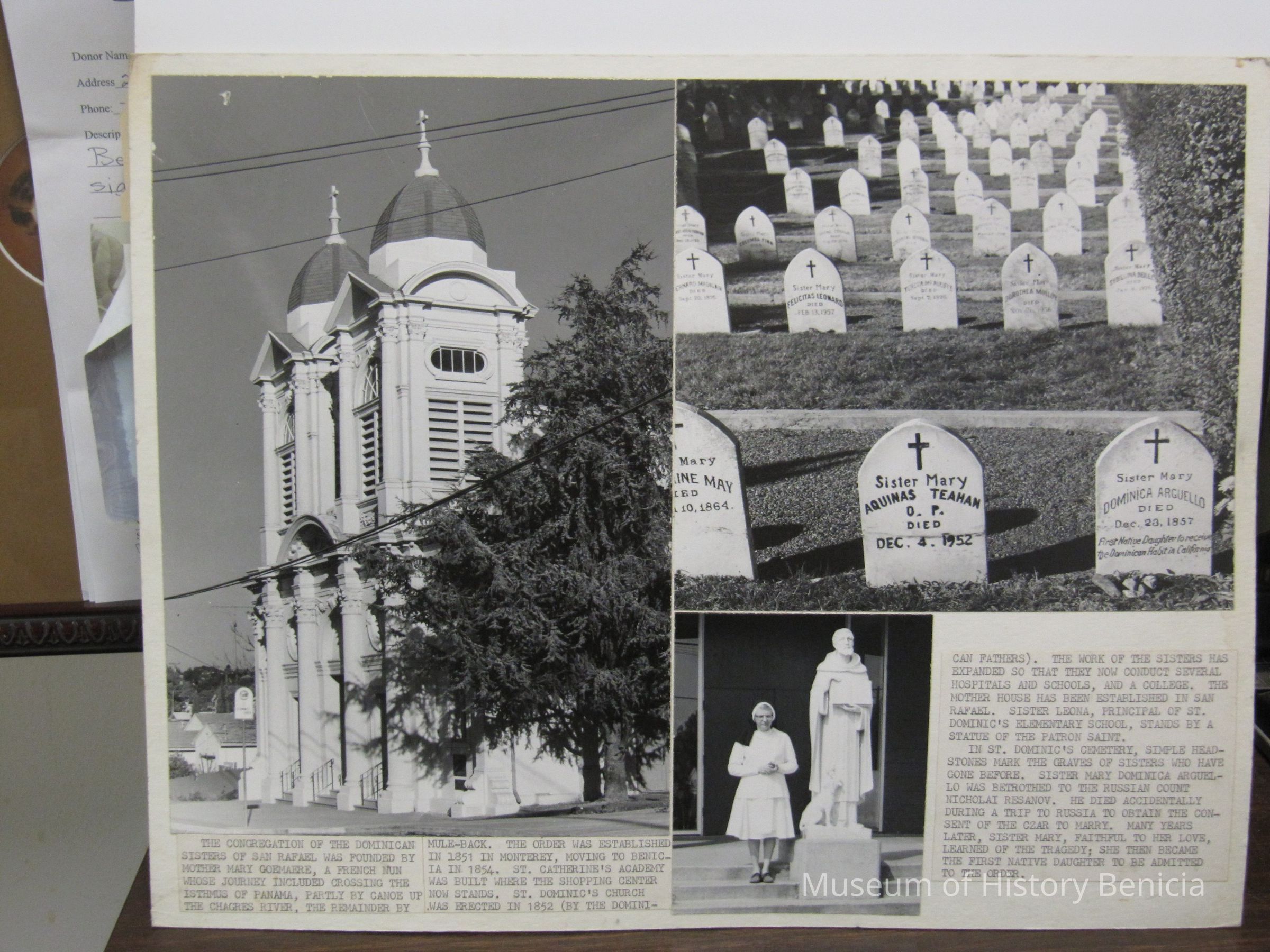 Three photos. Left: St. Dominic's Church, black and white. Upper right: cemetery, with headstones of Dominican sisters. Lower center: statue of St. Dominic. Typed description of the pictures given.Collection