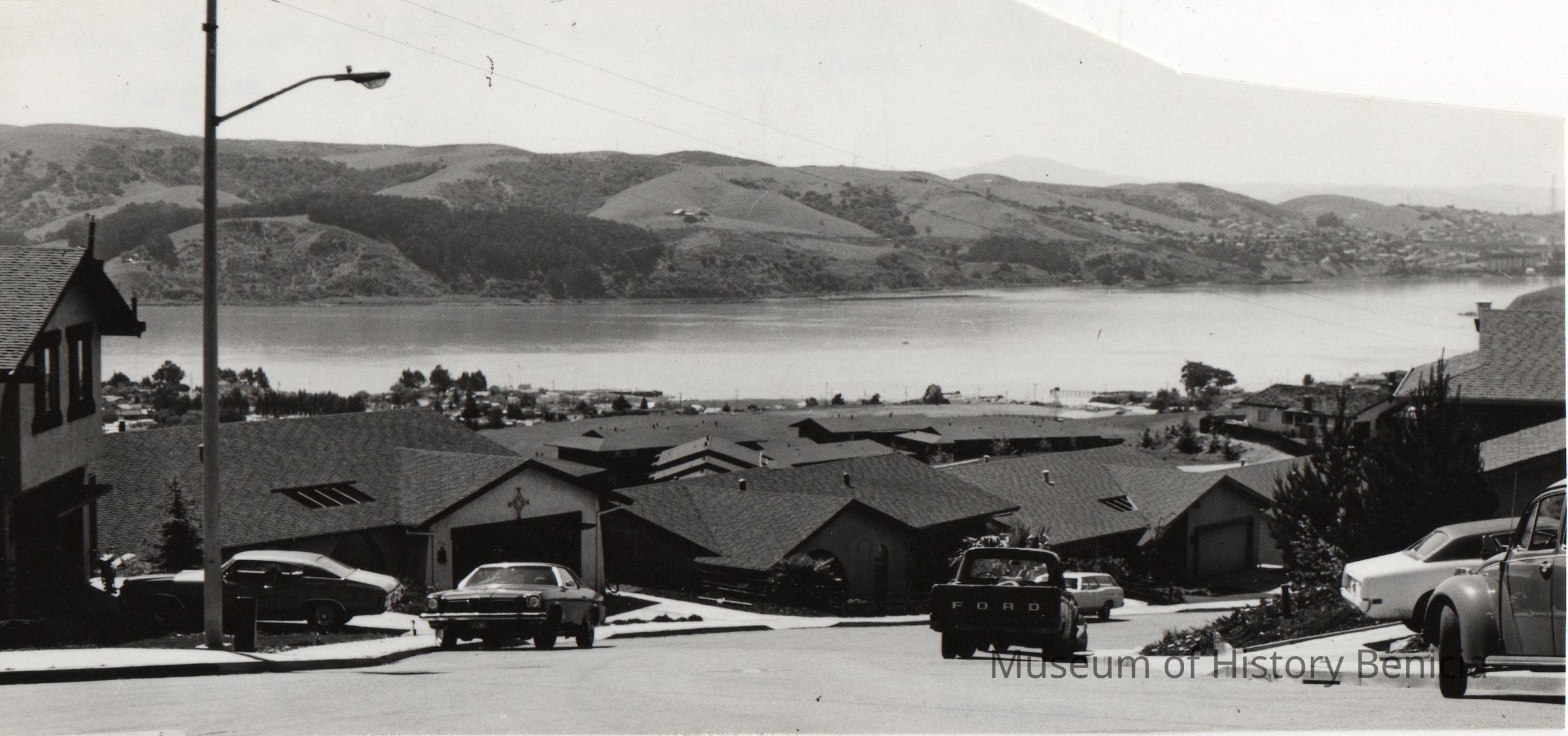 B/W photograph of new Southampton houses, looking south over Carquinez Strait.