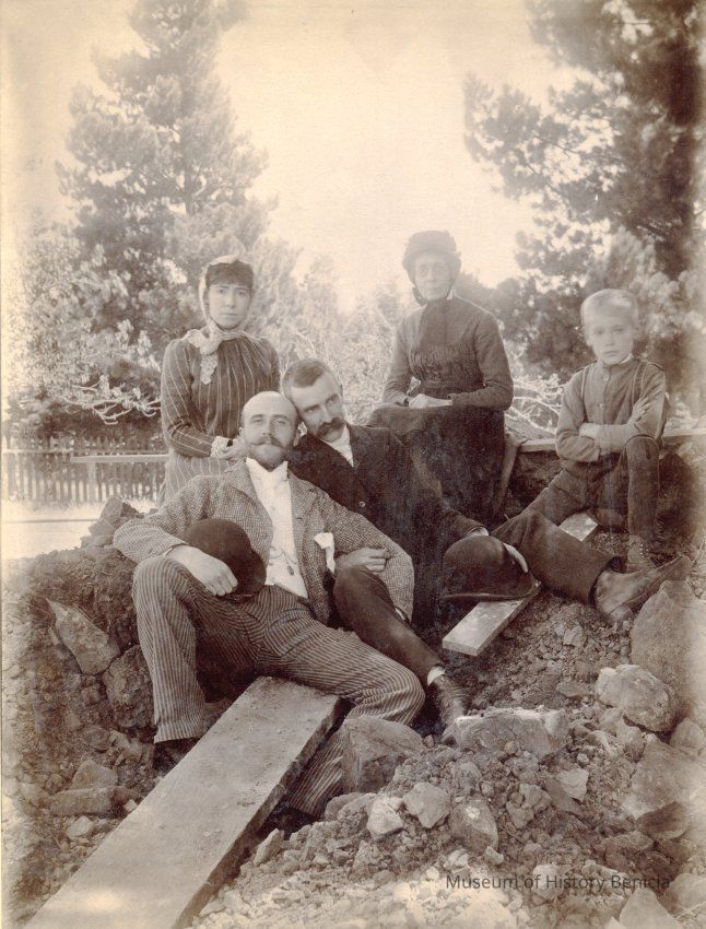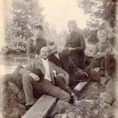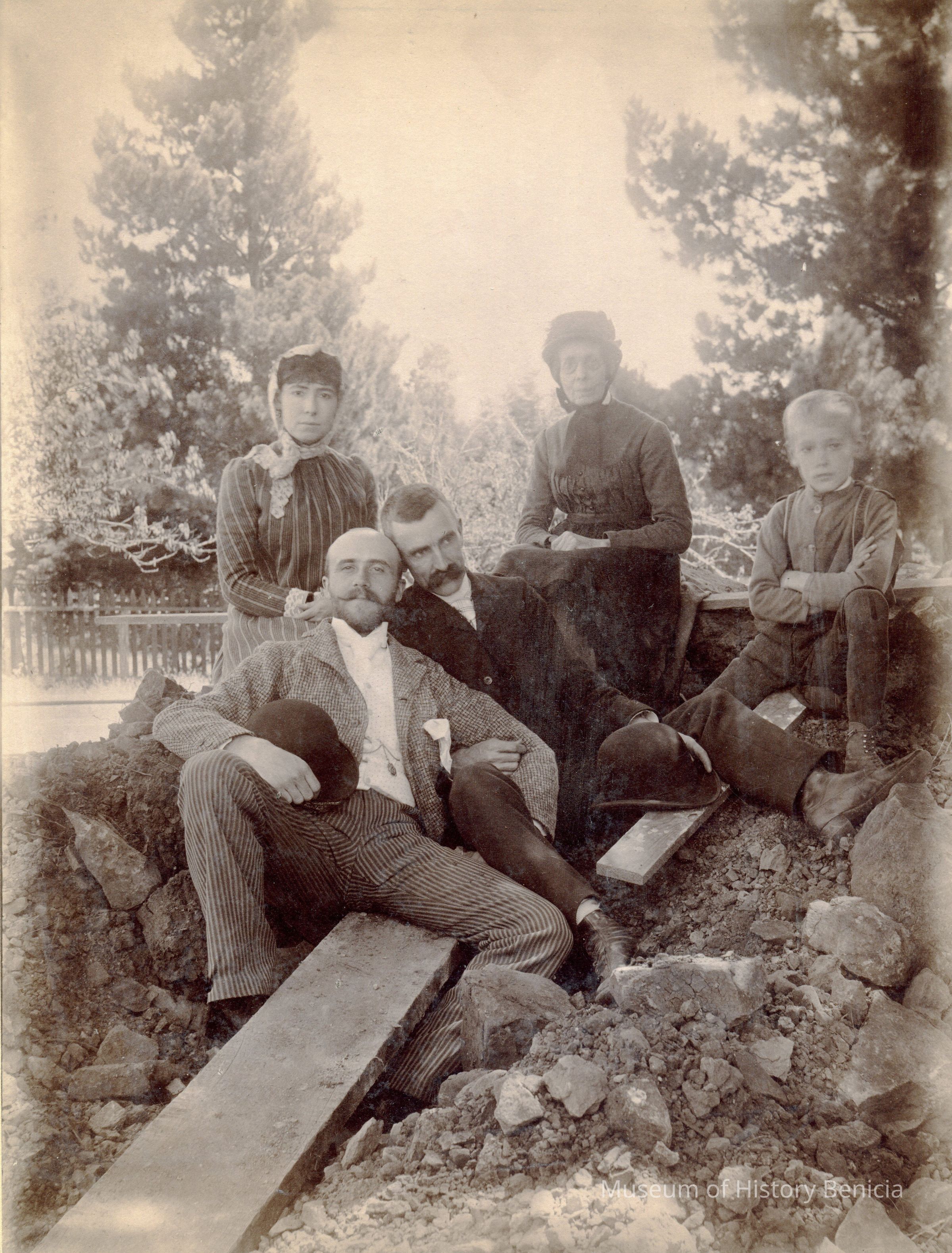 Photo of a family outside in a pile of dirt. There are two middle aged men, a boy, a young woman and an older woman. The younger woman looks like Henrietta Riddell-Fish. The man in the middle with the dark suit and large mustache, may be her husband Franklin Fish.Collection