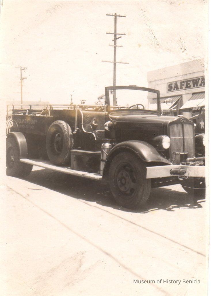 B/W photograph of a Benicia Fire Dept. Truck parked in front of the station when it was on First Street by the old State Capitol Building (1940's) - the old Safeway is in the backgroundCollection
