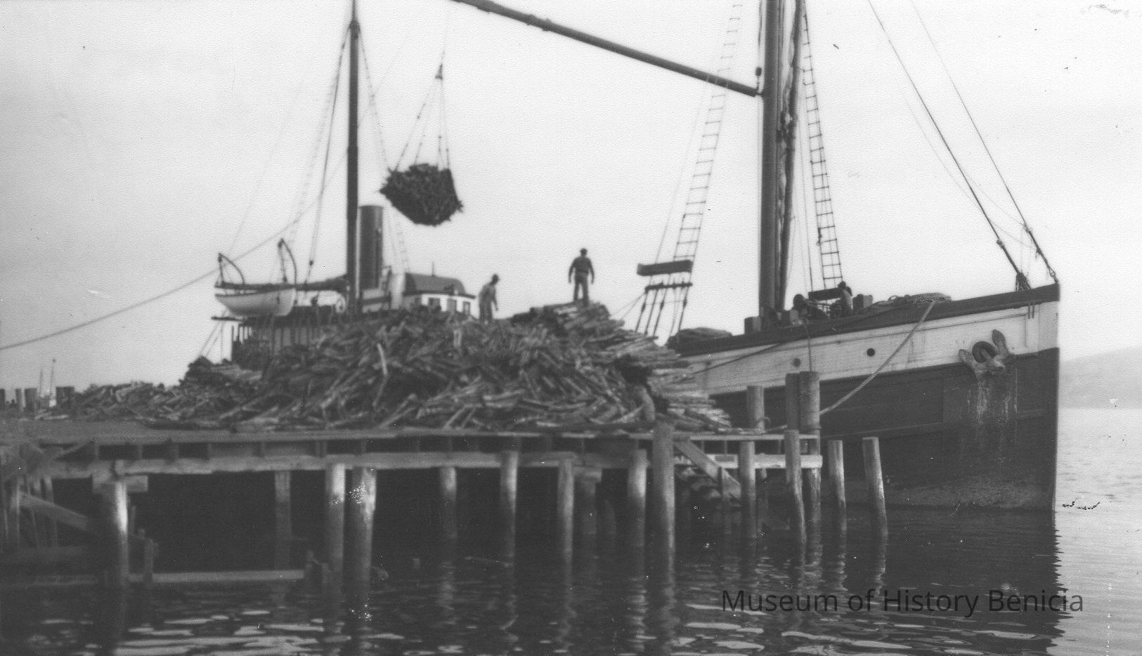 B/W Photograph: A load of tanbark being unloaded at the Benicia wharf. The tanbark was used at the Kullman Salz Tannery.