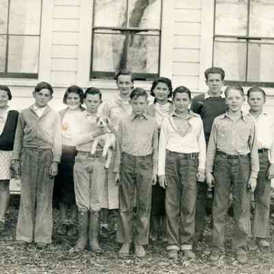 This is a photograph of a group of school age children in front of a building. One boy is holding his dog. The clothes look like it was taken in the 1920s or early 1930s.Collection