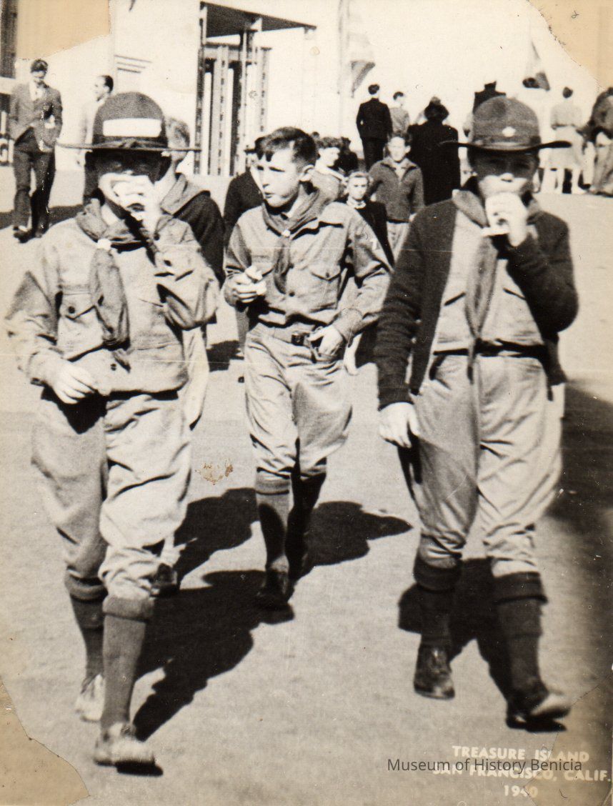 B/W photograph of Boy Scouts (L to R) John Dinsdale, Bruce Dean, and Dennis Robbins at the Worlds Fair Treasure Island, Ca in 1940