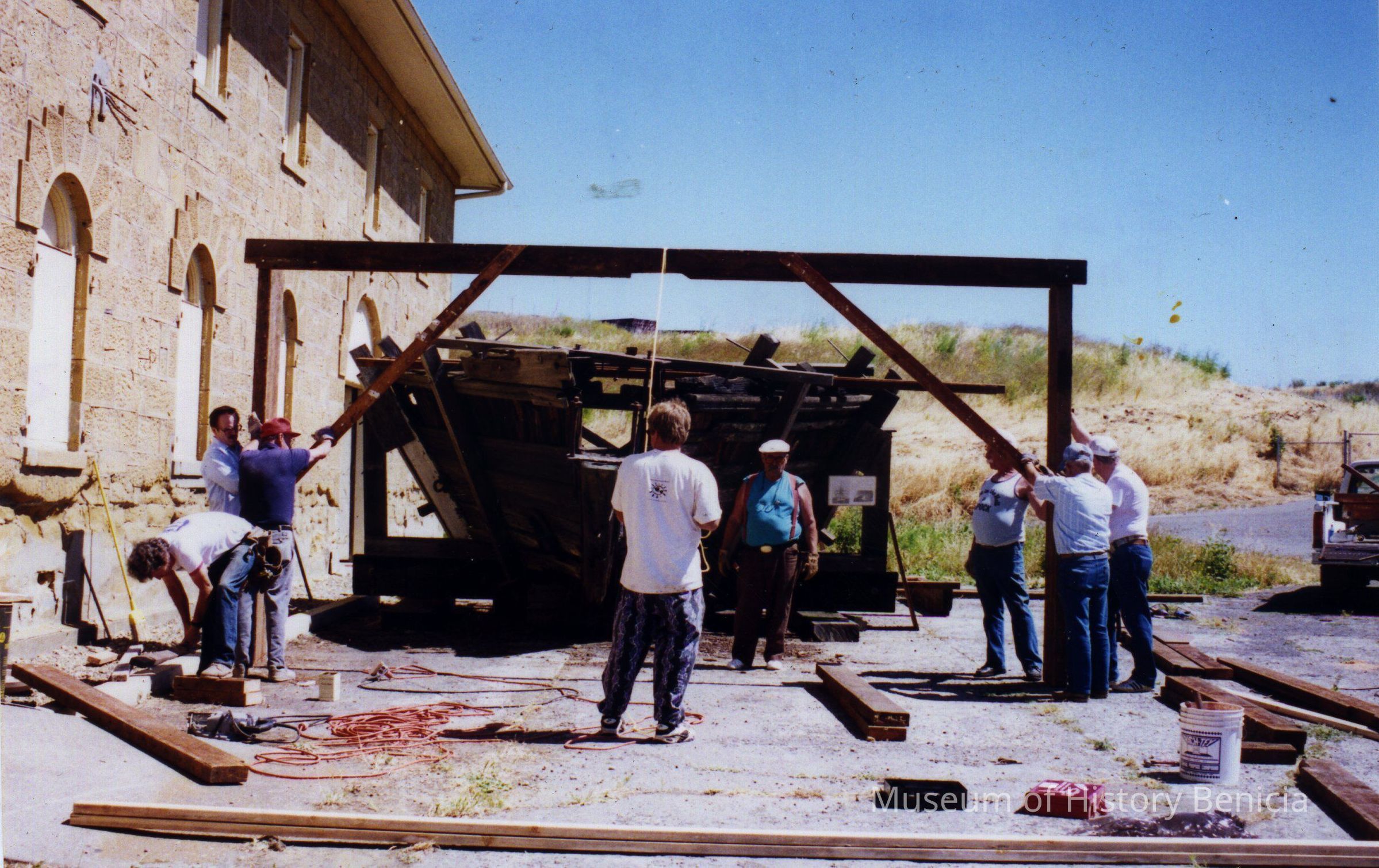 Ted Anderson, Jim Phelan, Tom Hosley, Peter Bray, Ron Rice, Dick Lubin, Vernon Gross (volunteers) building the cover for the bow of Matthew Turner's ship "Galilee". Color photo.Collection