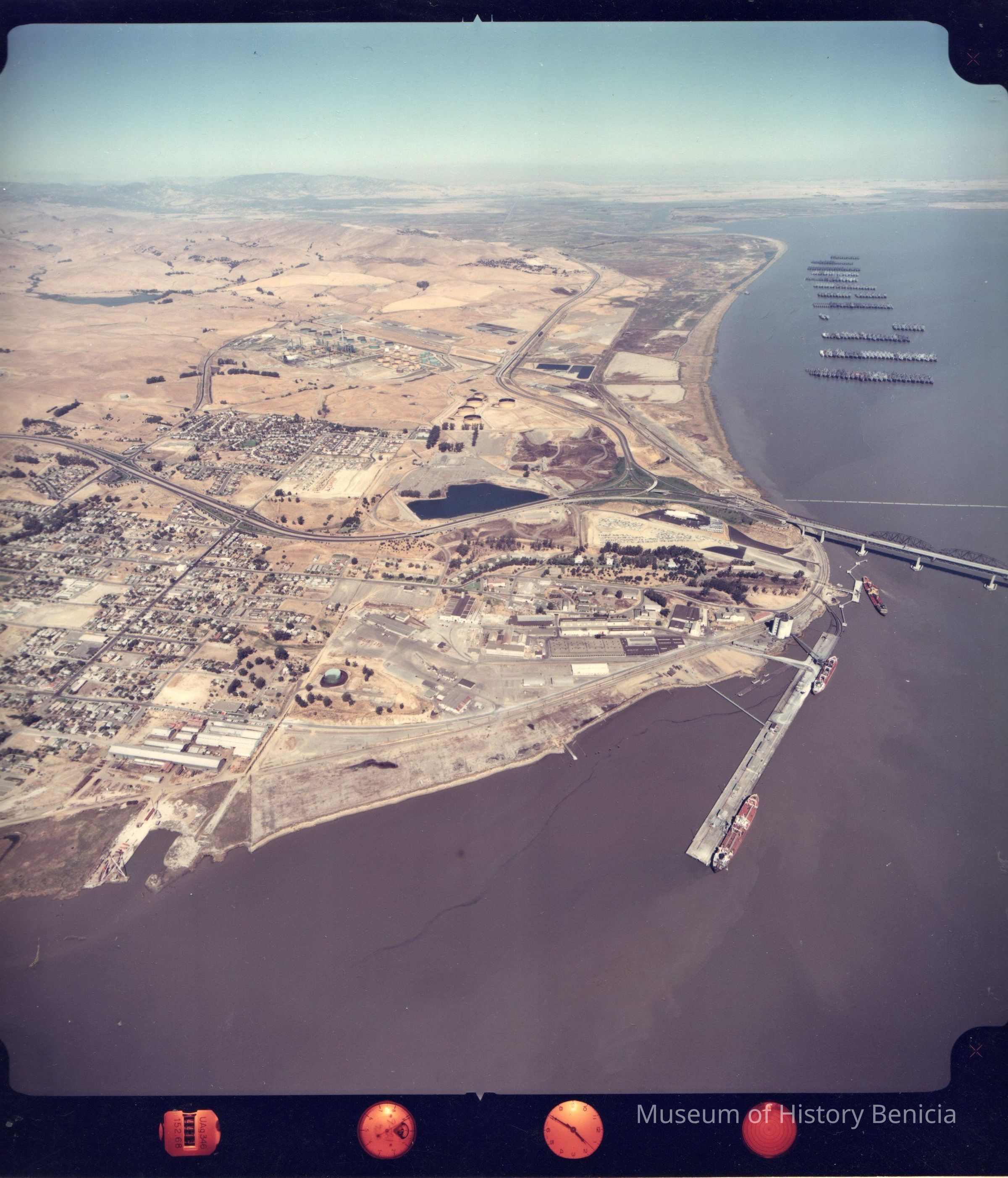 Shows portions of Benicia Arsenal, Yuba Mfg. Co., Mothball Fleet and docks. Series 23868 No. 3. Color photo.