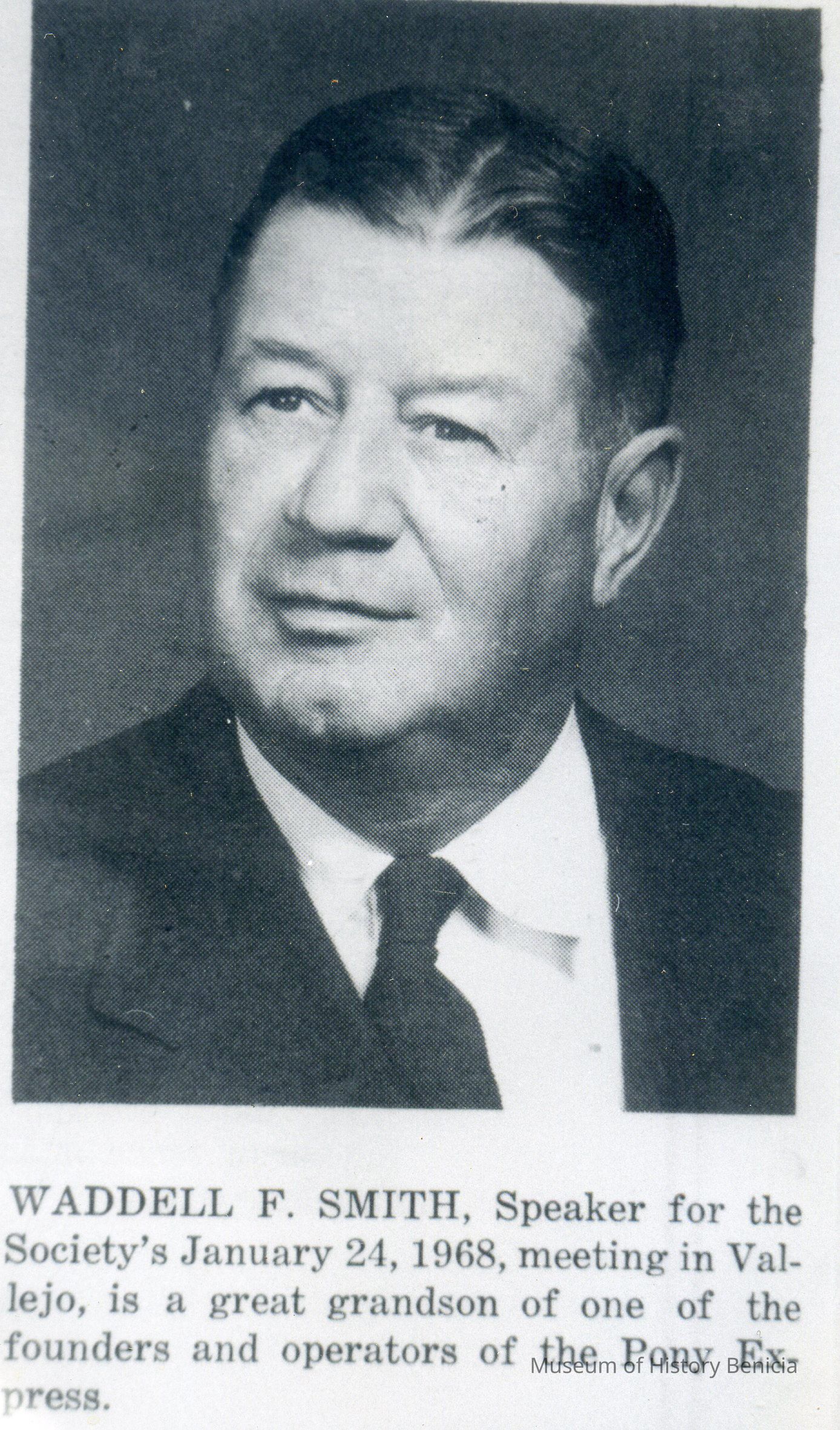 B/W photograph of Waddell F. Smith, Speaker for the Society's January 24, 1968 meeting in Vallejo (great grandson of one of the founders and operators of the Pony Express).Collection