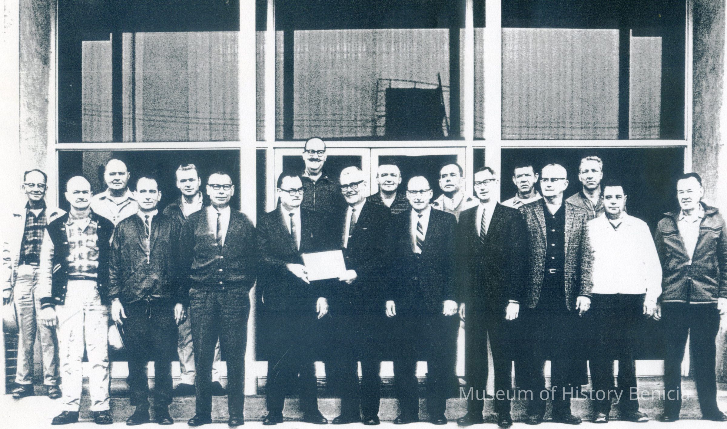 Group Photo of Production staff at Yuba Mfg.Co. 1967. Front Row L/R: Orval Boyd, Al Koolon[?], Manual Christo, Leon Bates, Unknown, Unknown, Unknown, Unknown, Frank Northway, Frank McGelient[?]. Second row L/R: Unknown, John Applegate, Jury, Unknown, Jack Coover, Rul Neburn, John Calahan, Ken Nunn. Black and white photo.Collection