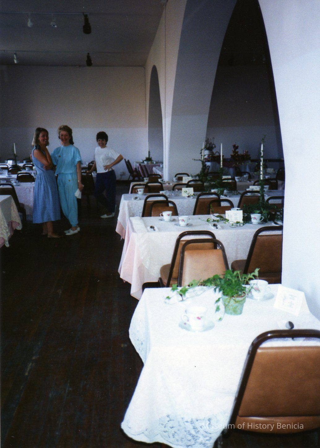 color photo of three standing women, Lisa Ericson on left, unidentified in center, Bev Phelan on right (per back of photo) during set up for the teaCollection