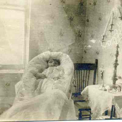 B/W photo of a baby in a casket. This is a post-mortem photo of a small child. E.C. Dana family and friends.