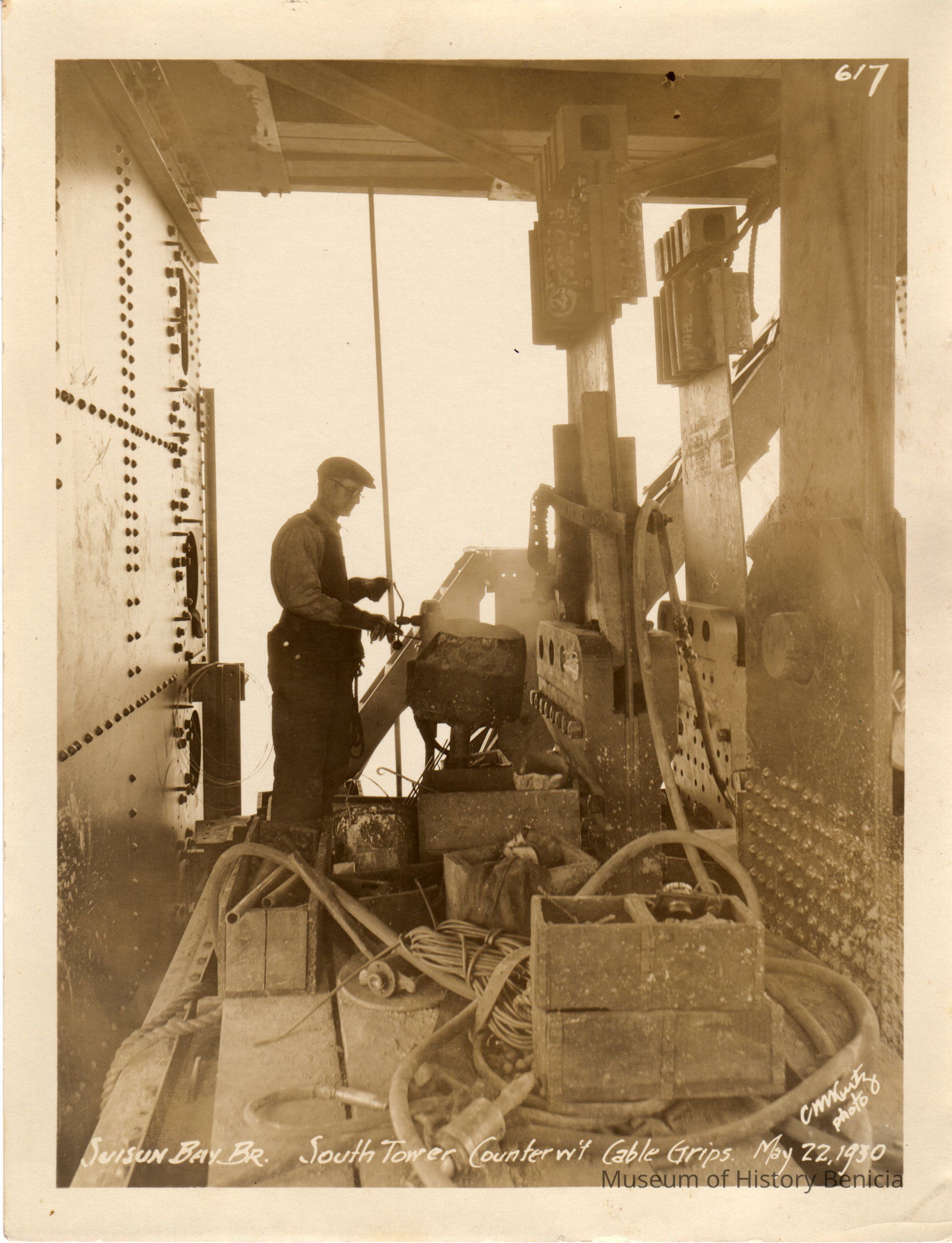 Sepia toned photograph of the Suisun Bay Bridge south tower during construction. There is a man at work with cable grips in the tower. Bridge spans between Martinez and Benicia. May 22, 1930. Bridge built by the Southern Pacific CompanyCollection