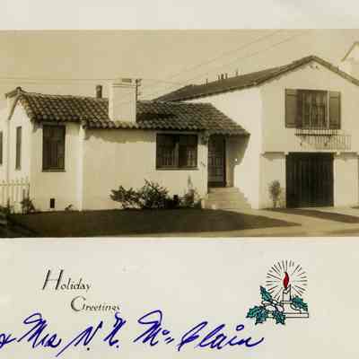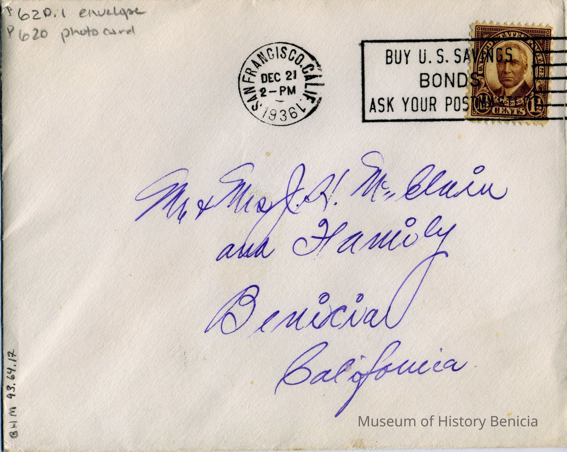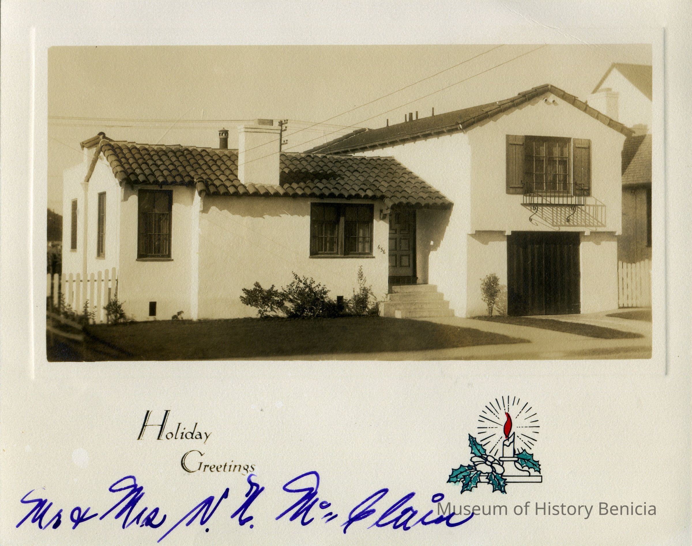 Christmas photo card from Mr. & Mrs. N. McClain. House number 656; stucco with tile roof. Envelope postmarked "San Francisco, Calif. Dec. 21, 1936 2 PM". 1 1/2 cent stamp cancelled with "Buy U.S. Savings Bonds - Ask Your Postmaster". Envelope addressed to Mr. & Mrs. J.H. McClain and family, Benicia, California. Black and white photo.Collection