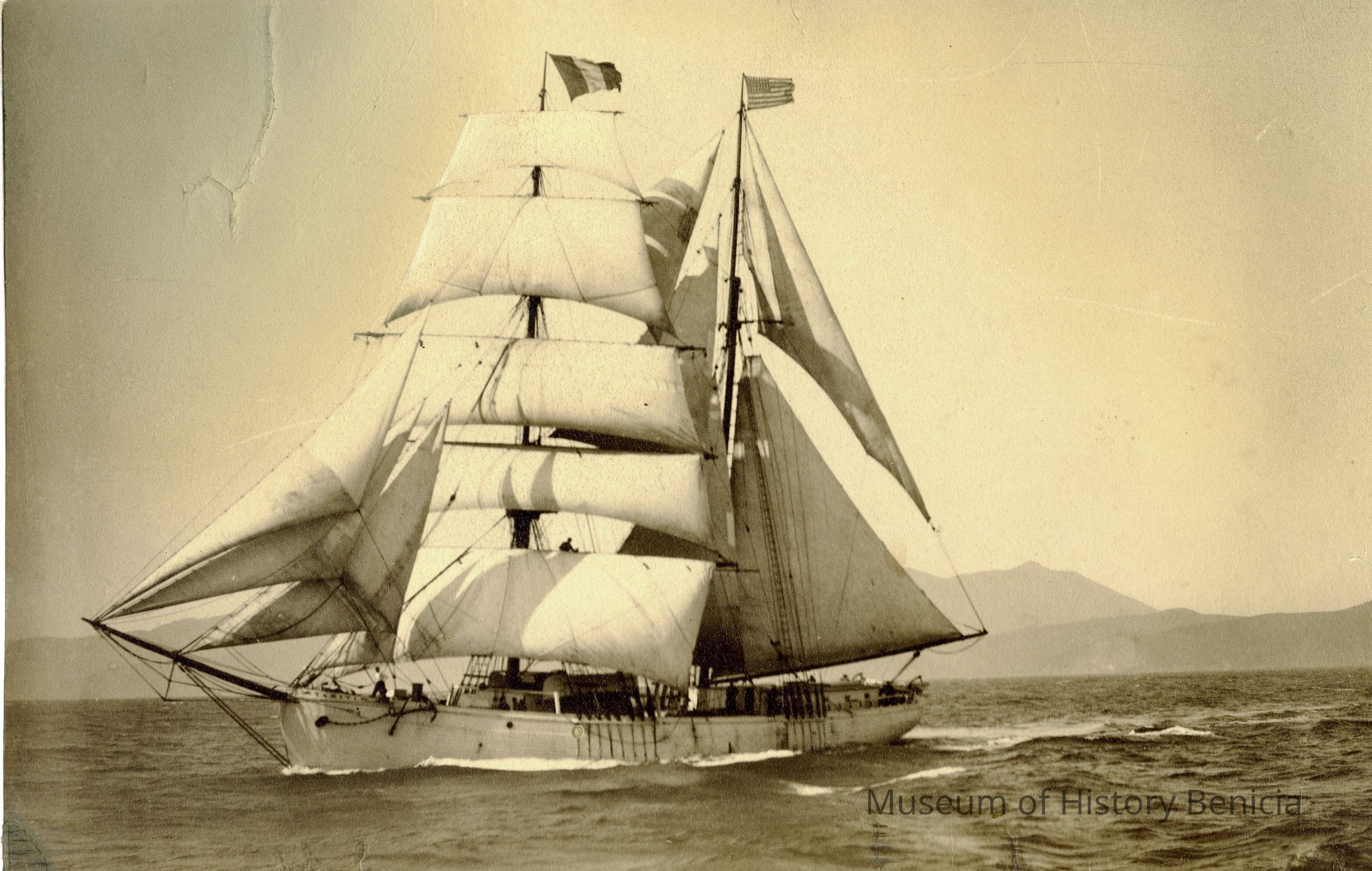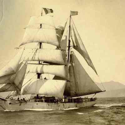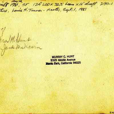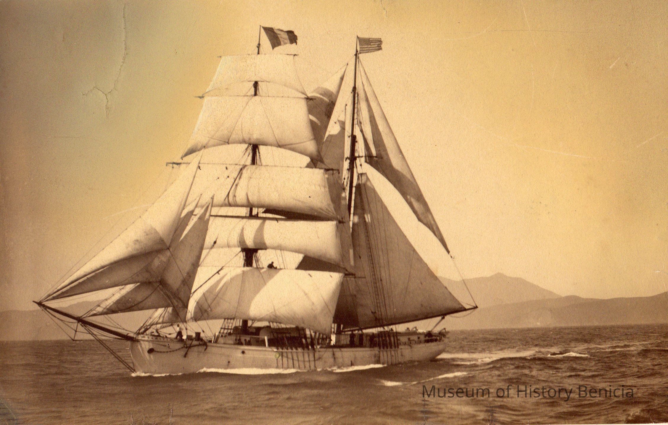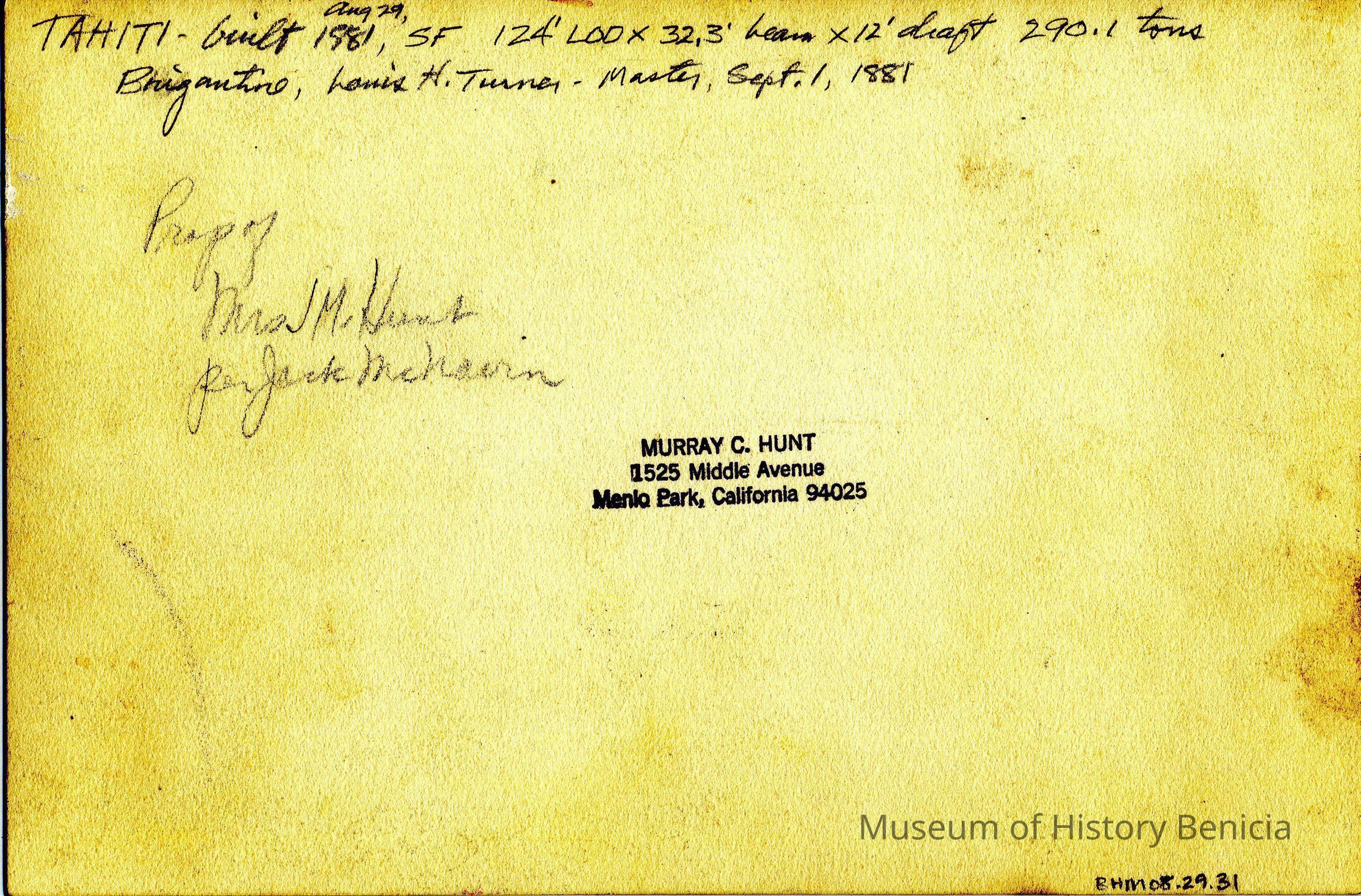 Sepia toned photo of the Tahiti built on August 29, 1881 in San Francisco. 124' x 32.3' beam x 12' draft. 290.1 tons. Brigantine, Louis H. Turner - Master, September 1, 1881Collection