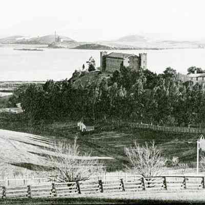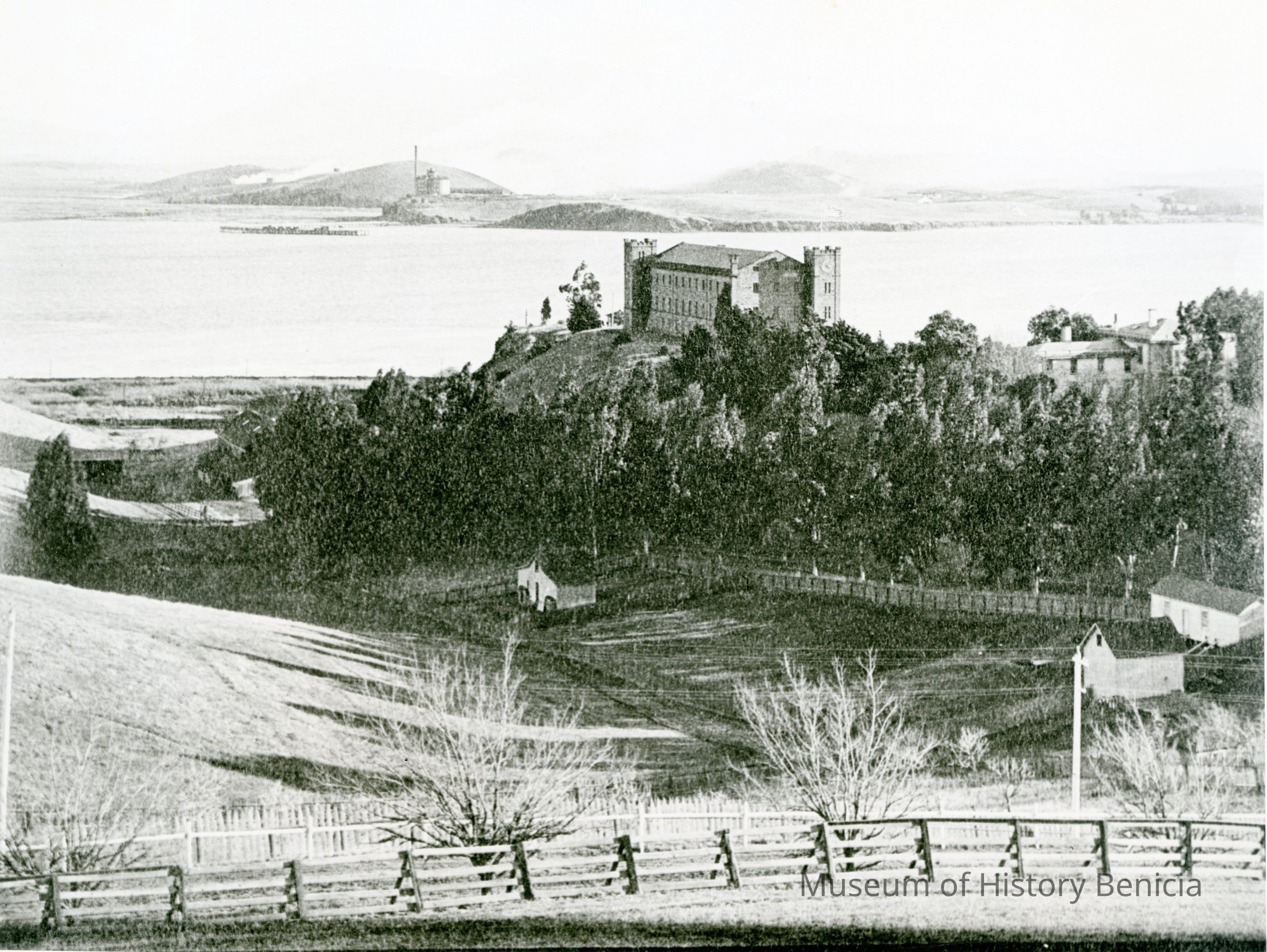 This is a photograph of the Clock Tower. This is building # 29 constructed in 1859. In this photo we see the building from a distance with the Carquinez Straits and Contra Costa county in the background. There is a small farm in the valley below the Clock Tower.Collection