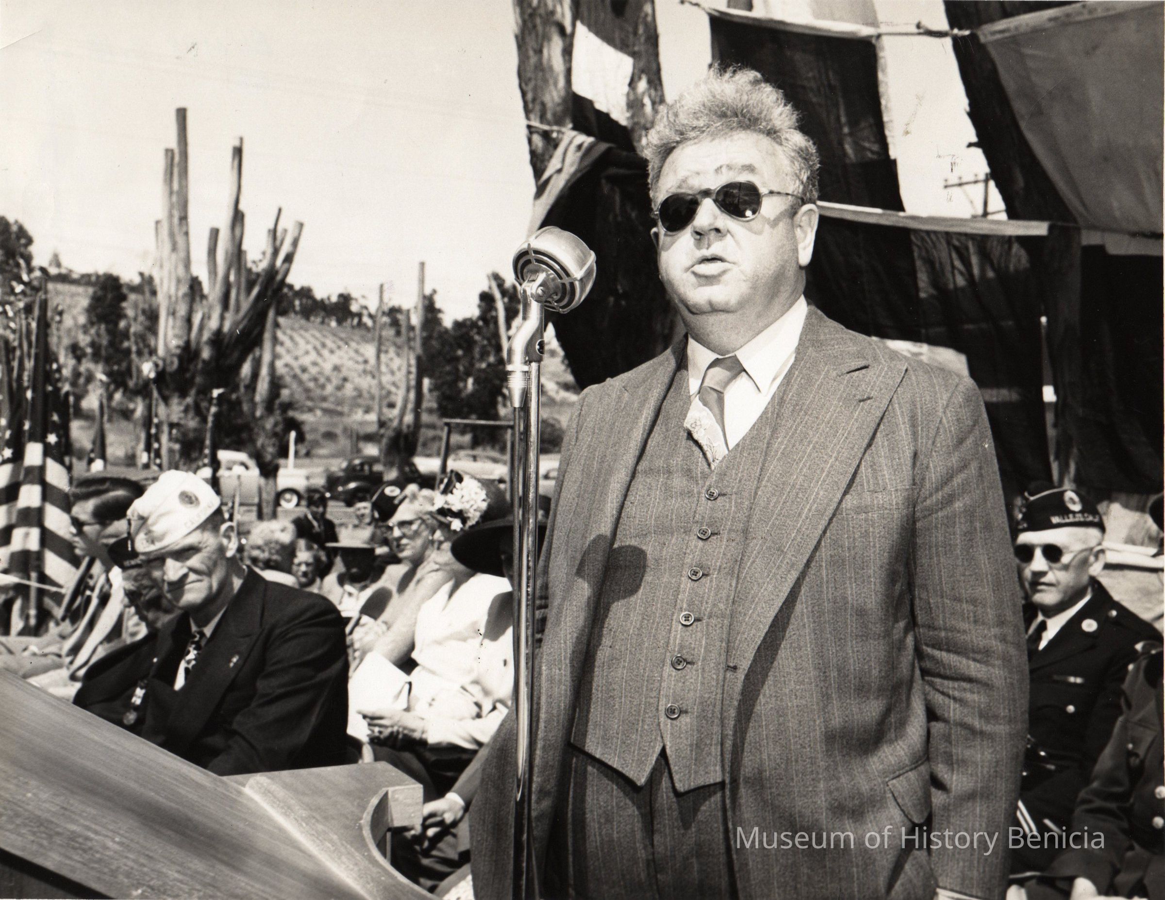 Black and white photo of mid-aged man in suit with microphone. Seated group behind, with bunting and flags. "Representative Ernest Ormby[?]" in ink on back. Possibly a picture of 25th anniversary ceremony for Carquinez Bridge.Collection