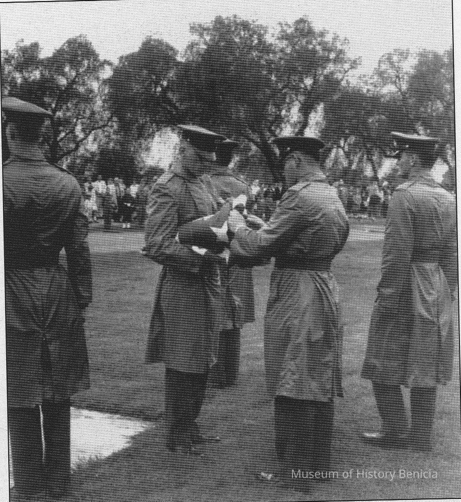 This photograph appeared on page 123 of "Images of America Benicia" with the caption: "The official flag take-down is performed in front of the headquarters of the Benicia Arsenal, March 31, 1964. .......[information on the Arsenal's importance]"Collection