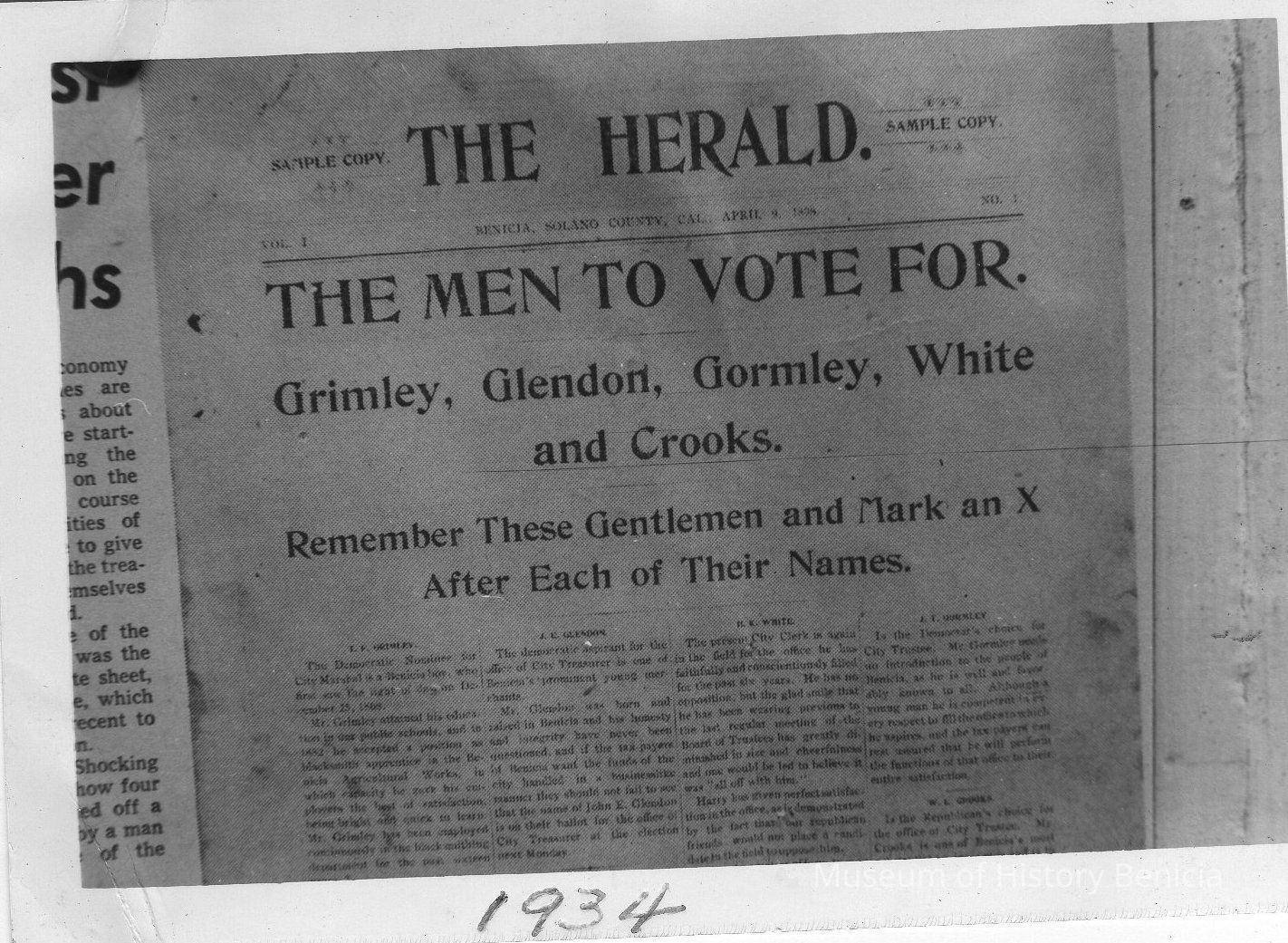 B/W photograph of a photograph: Front page of The Herald (a Benicia Newspaper) 1934;