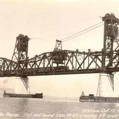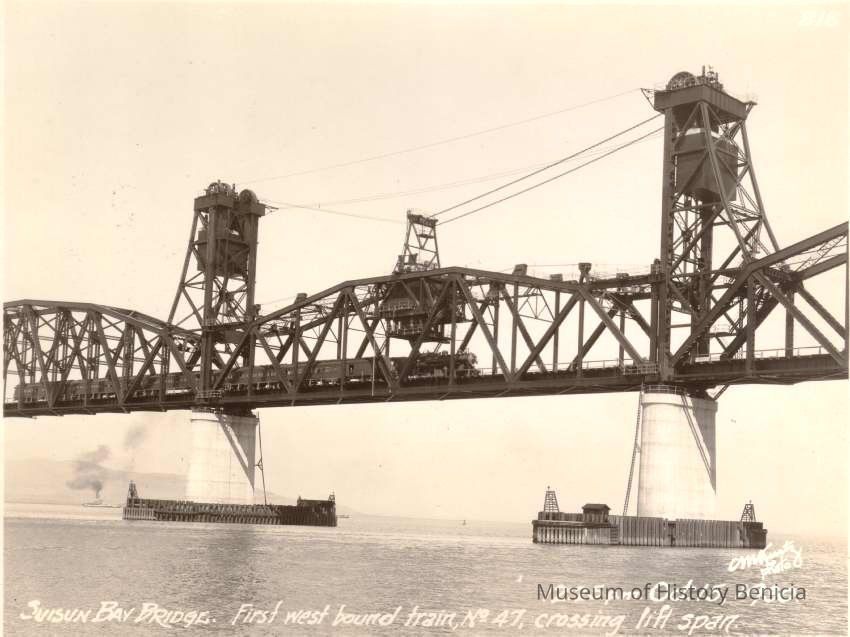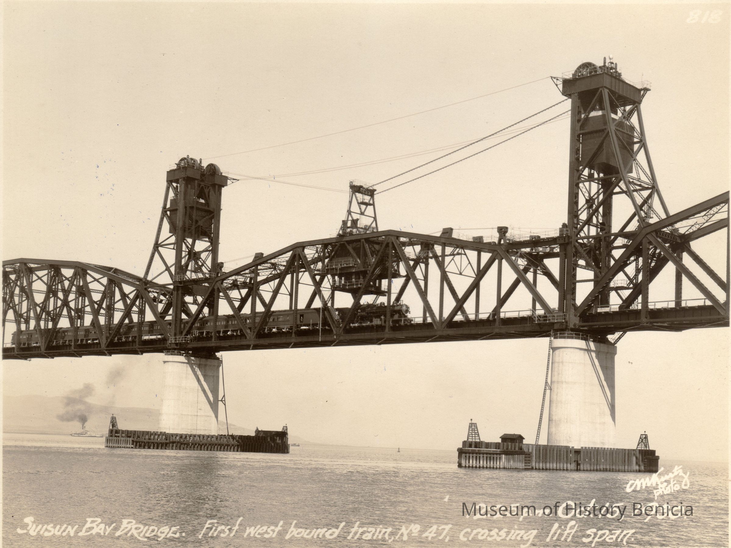 caption is: Suisun Bay Bridge first West bound train, No 47, crossing loft span