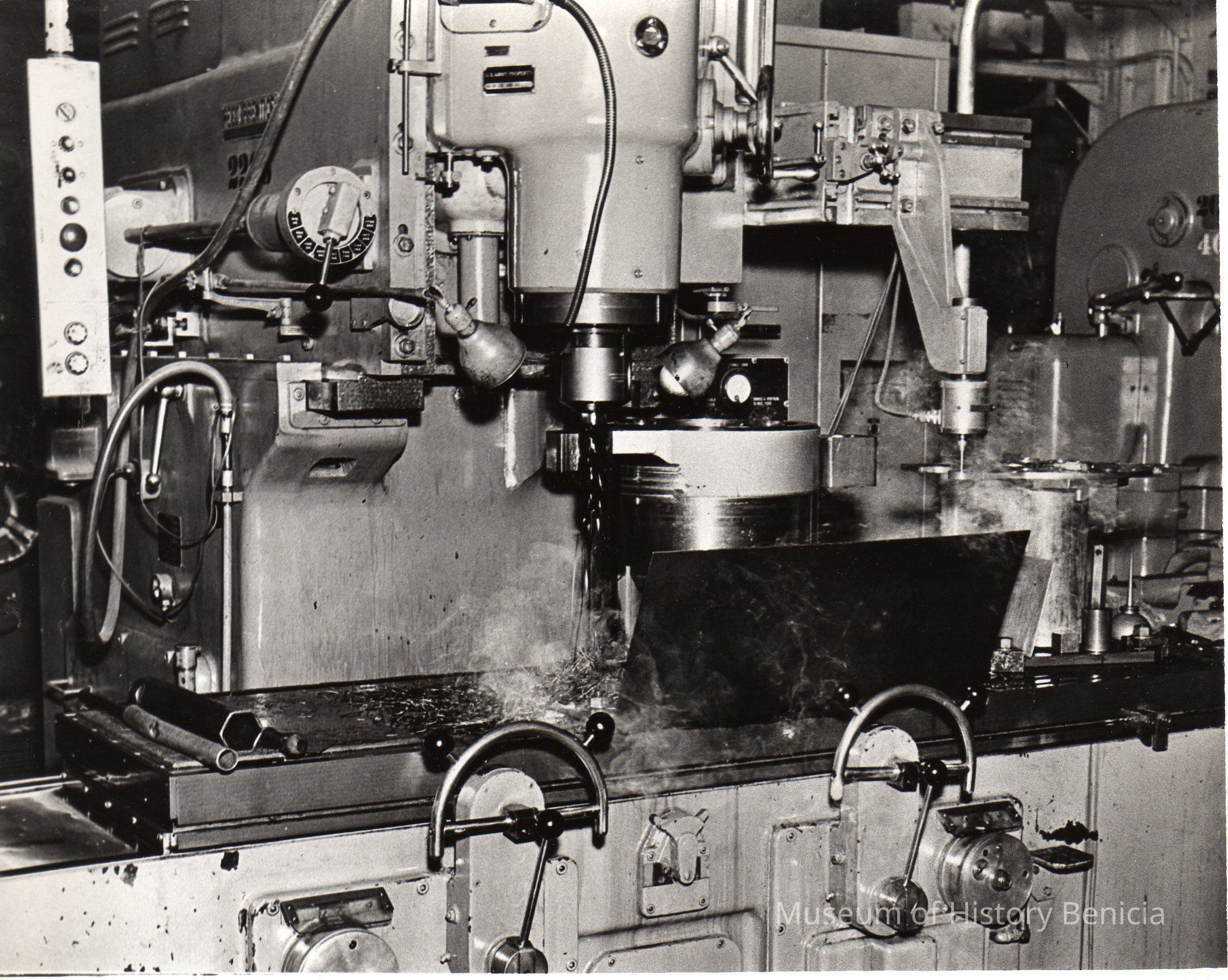 Top print: Breech blocks being machined for 155 mm howitzers, 1953. Black and white photo.