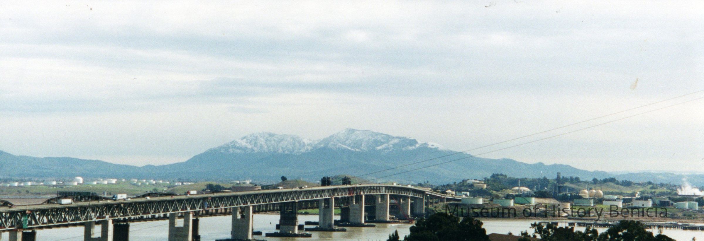 Color photograph. Panoramic view of a snow capped Mt. Diablo, Benicia and Train bridges, and refineries