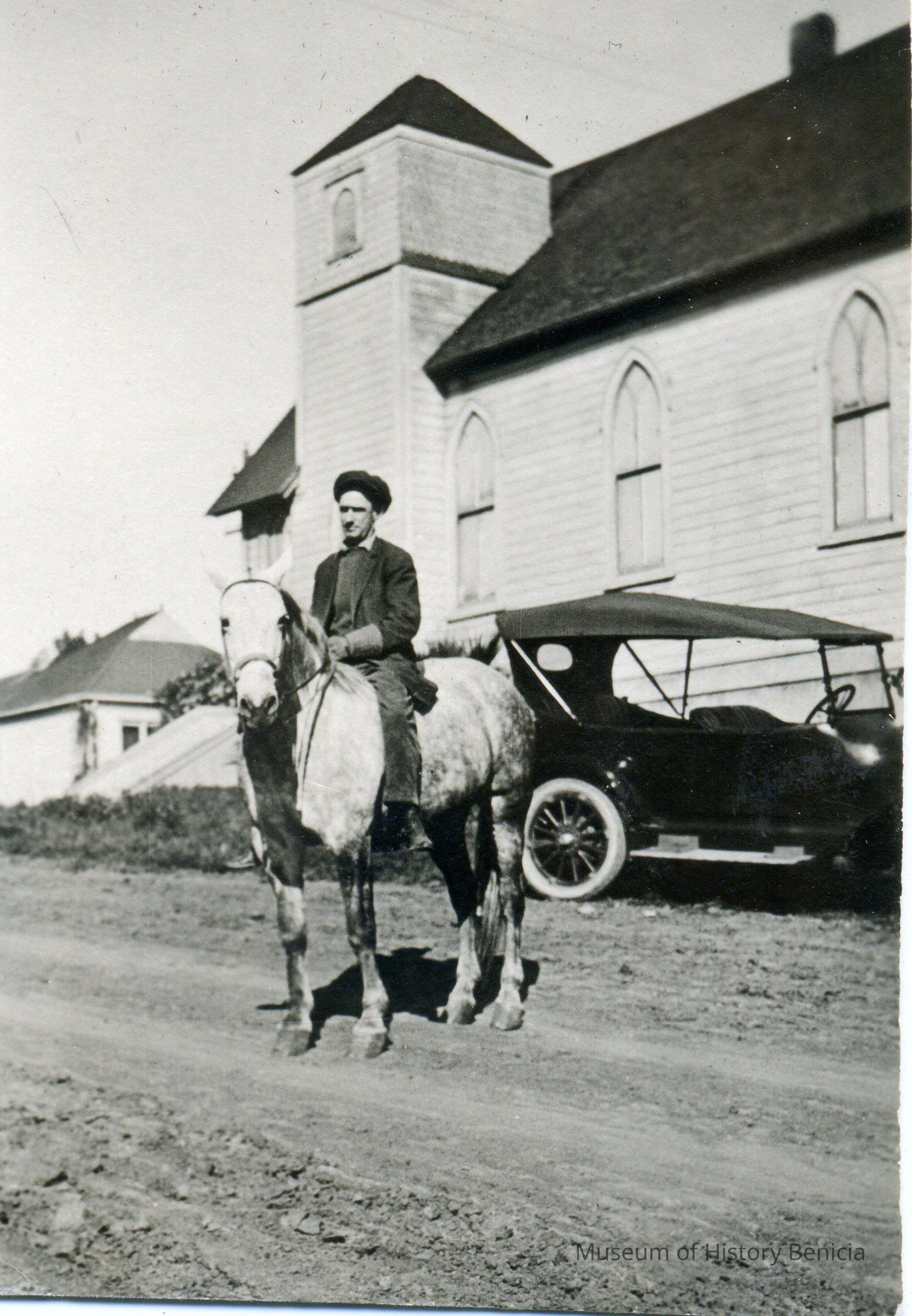 Jack McCarin on horse at West Second Street. Church (now Dials Antiques) in background; also, touring car in background.