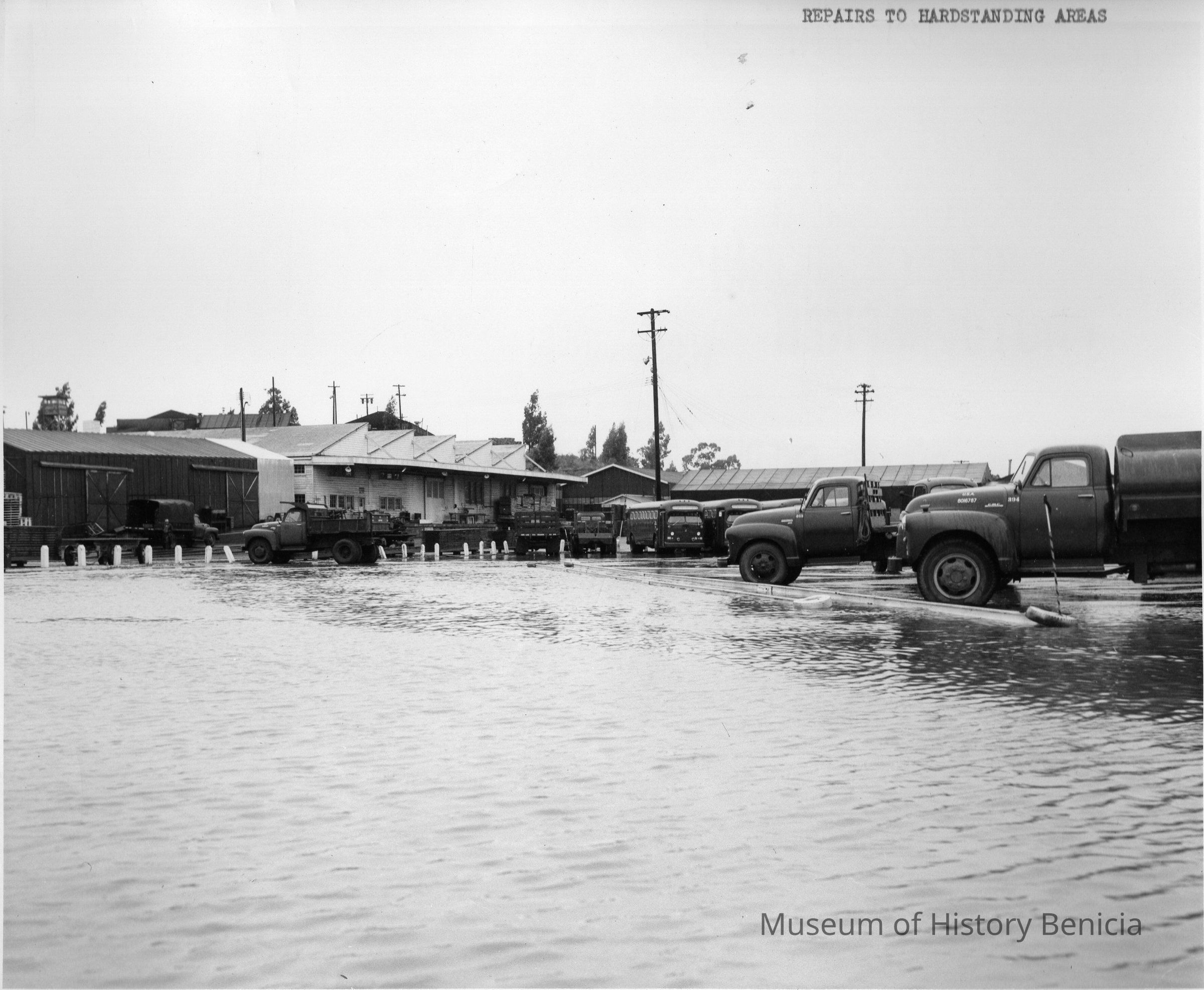 B/w Benicia Arsenal, repairs in the hardstanding areas after flood. Shows Flooding in B.A.