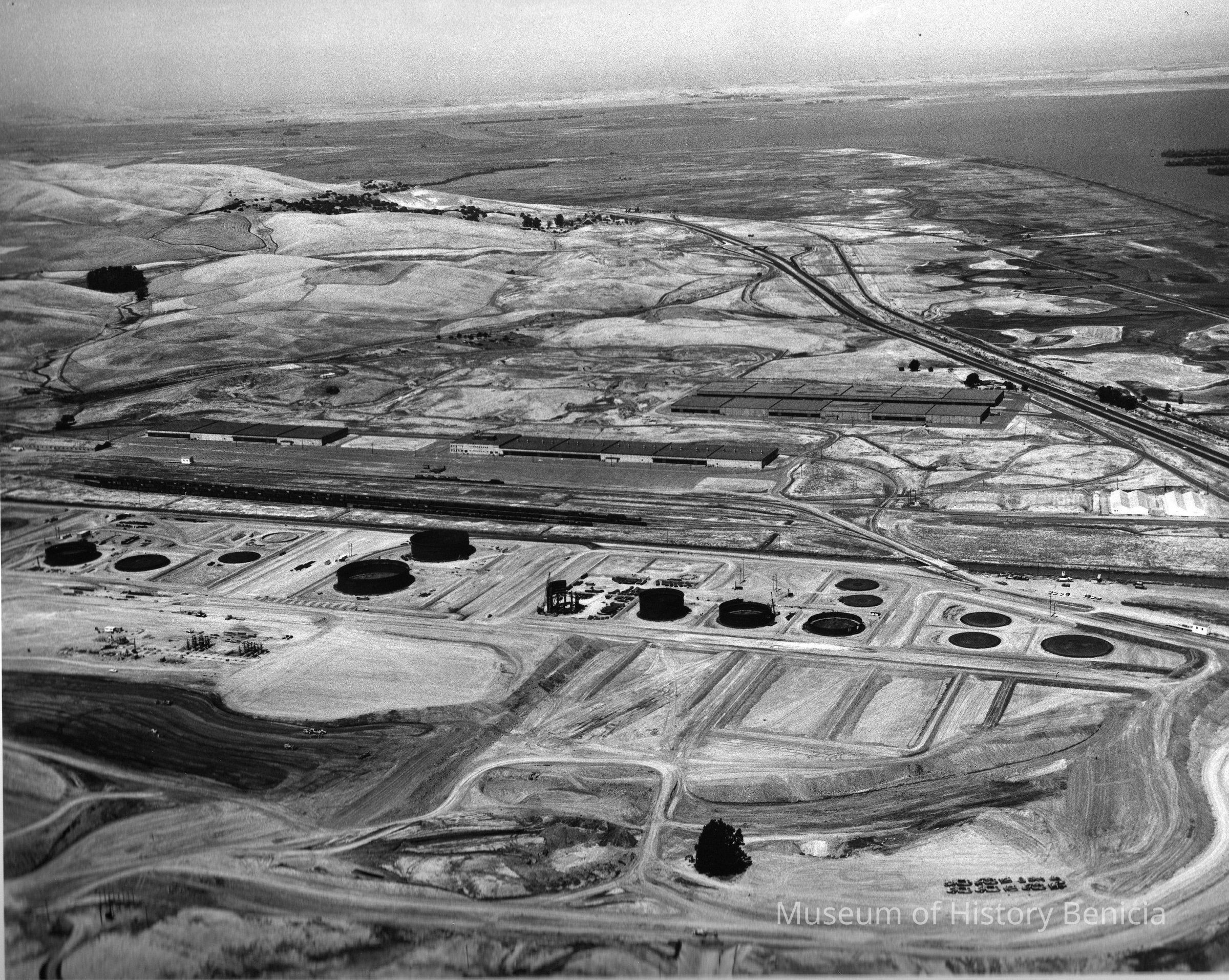 B/W aerial view of early construction of the Humble Oil Refinery (later Exxon and Valero) looking north; center: warehouses; upper right: railroad cars on sidings, 680 freeway/ lower center: storage tanks under construction and graded pads; far right: marshes above freeway and Suisun Bay; far right upper corner: northerly edge of Reserve (Mothball) Fleet.Collection