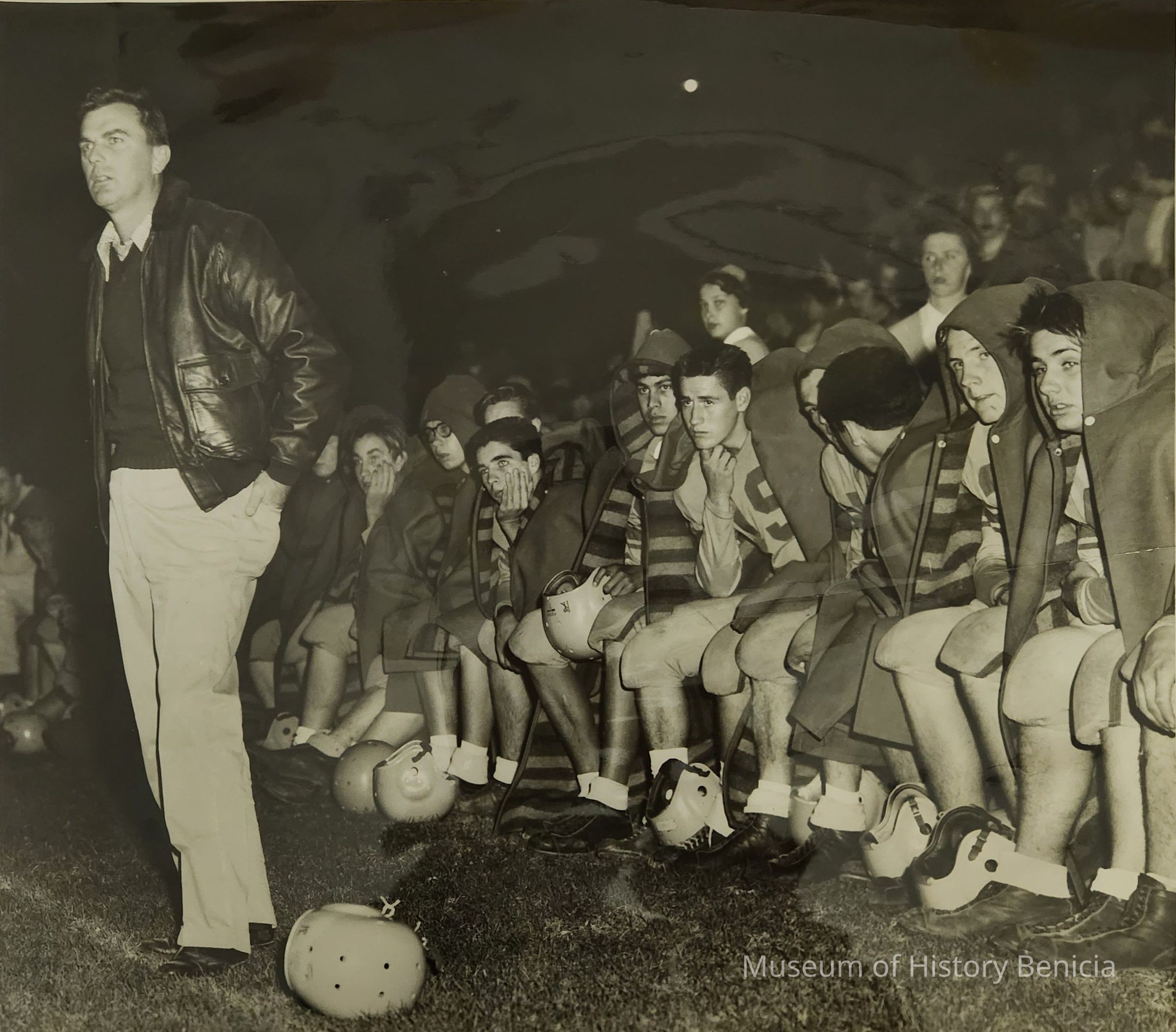 B/W Photograph of Phil Goettel standing in front of a bench full of football players in cold weather gear; The title written on the back is "1954 Football Team - game when their 19 game winning streak (which began in 1952) ended"; the photograph was taken on Sanborn Field by Leo Cohen (stamped on the back with the date). The game was the final game of the 1954 season against Rio Vista.