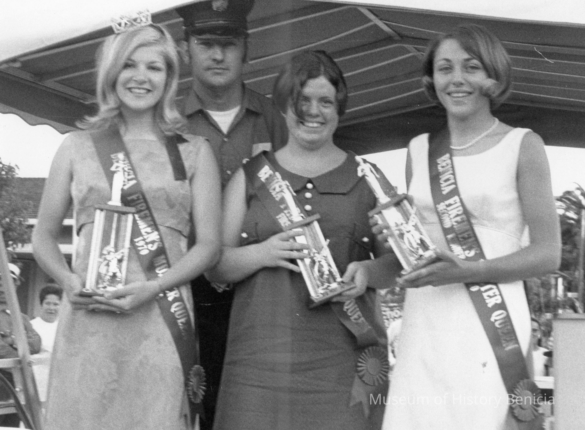 B/W Photograph - three young ladies in the Firemen's Muster Queen Court. An unidentified fireman is in the background.